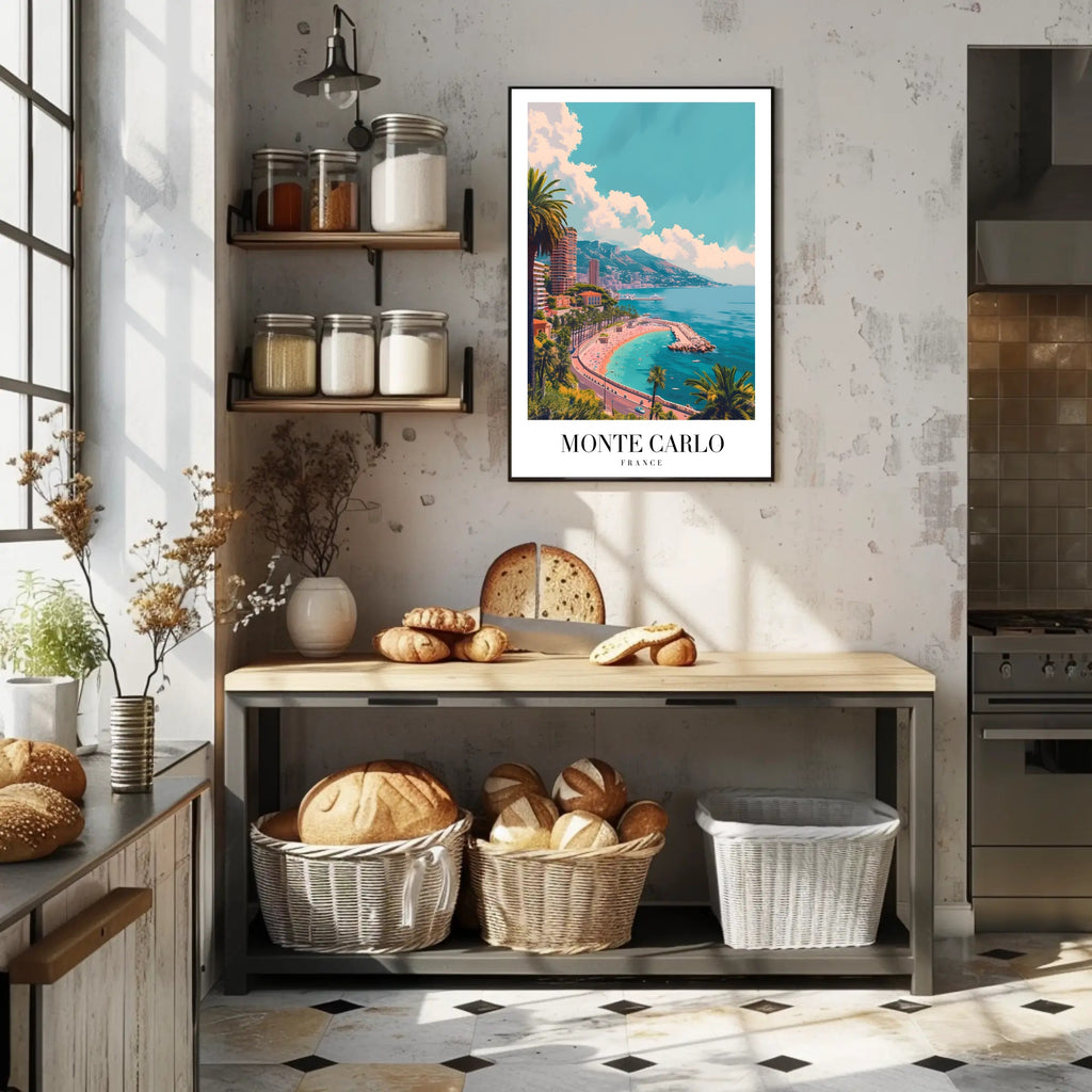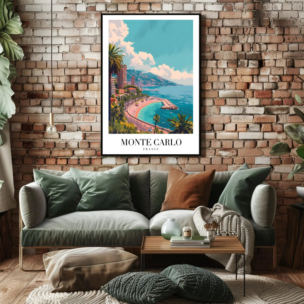 Experience the enchanting allure of Monte Carlo with this stunning travel poster, showcasing the lavish coastal city in all its splendor. Set against the backdrop of the French Riviera, this artwork captures a breathtaking view featuring a pristine beach, towering luxurious edifices, and elegant palm-lined shores. The vibrant palette of bright blues, lush greens, and soft pastel shades imparts a vintage travel poster aesthetic, reminiscent of mid-century elegance. Perfect for adding sophistication to any space, this poster embodies the timeless charm and opulence of this iconic Mediterranean retreat, bringing a slice of Monaco's glamour to your walls.