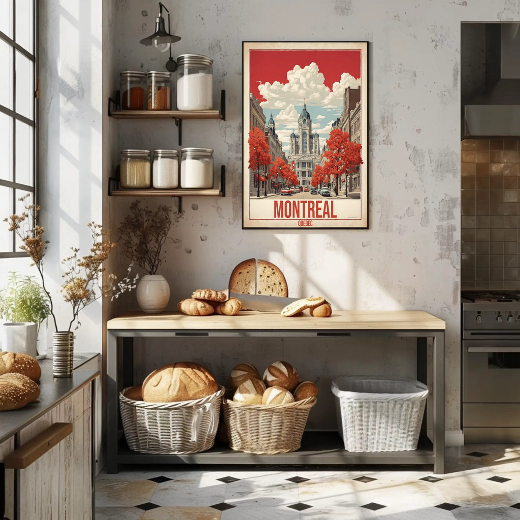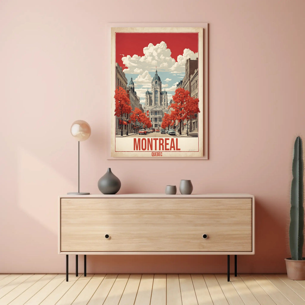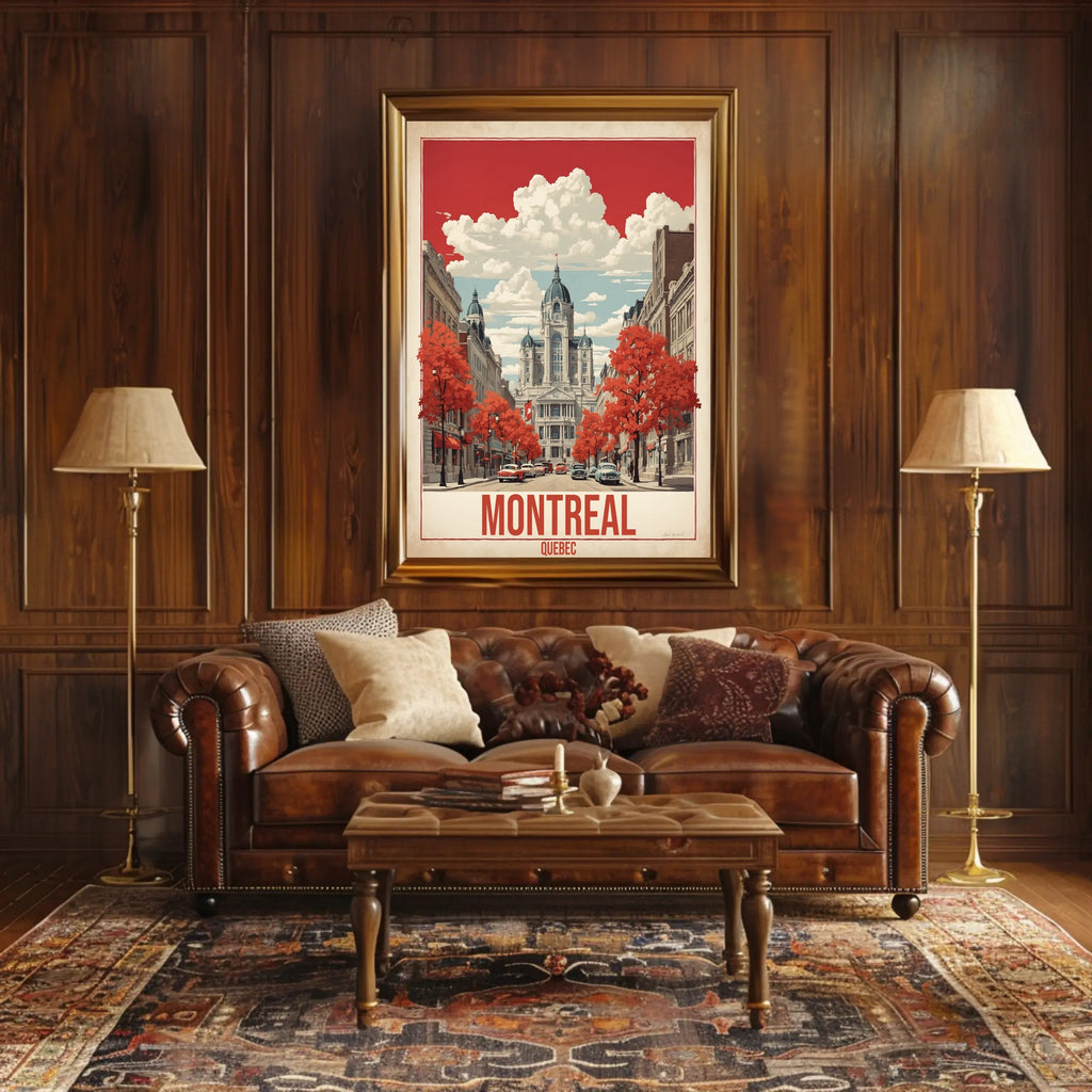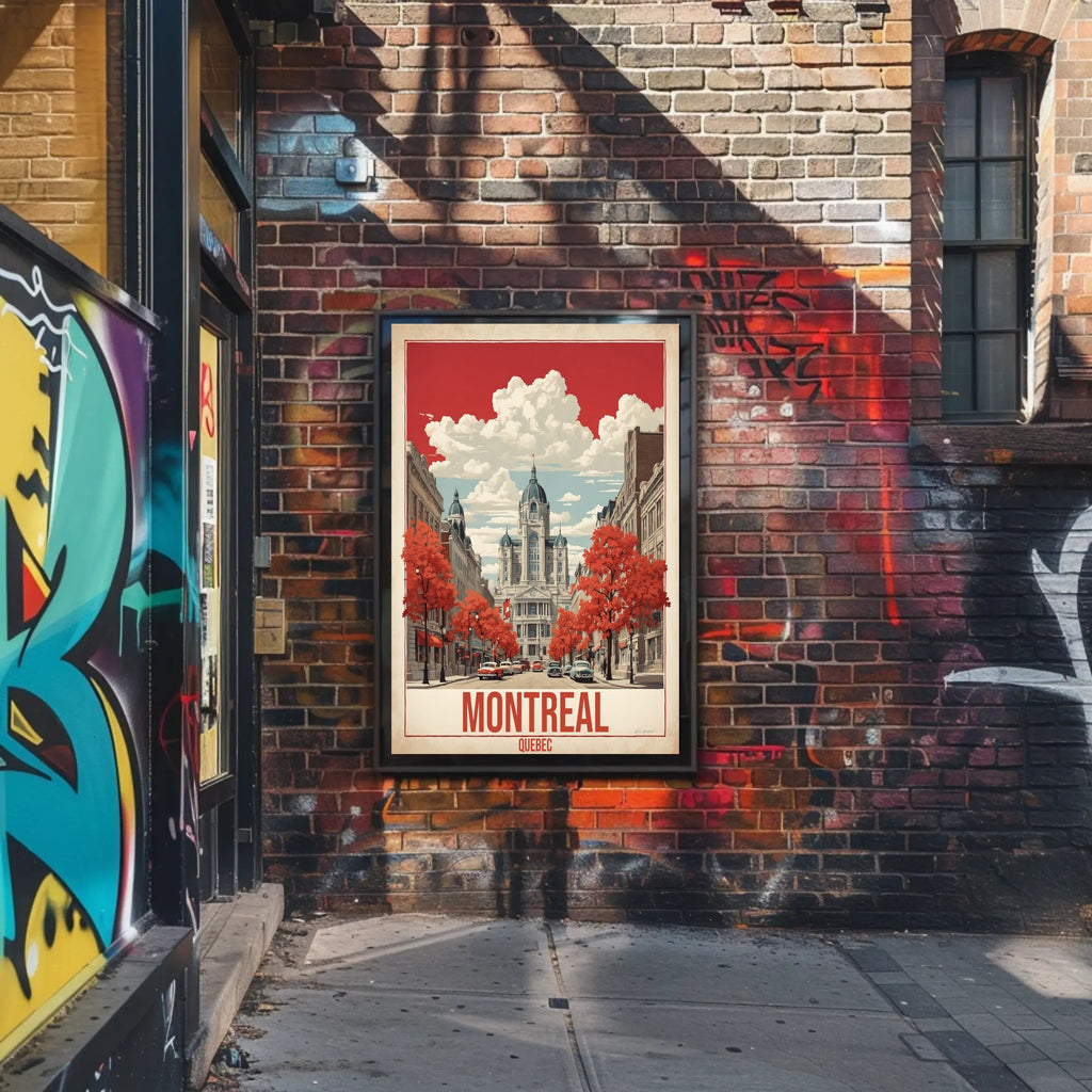 Experience the charm of mid-20th century Montreal with this stunning cityscape poster. Featuring a nostalgic street scene lined with vintage cars, the artwork transports you to a vibrant era of classic elegance. An imposing architectural marvel with European-style domes serves as the centerpiece, surrounded by the warm hues of autumn foliage. The dramatic clouds set against a bold red sky inject a surreal touch, adding depth and intrigue. Perfect for lovers of vintage aesthetics, this poster captures the essence of historical ambiance, making it a standout piece in any room.