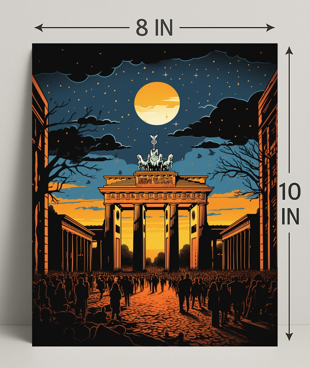Capture a moment of wonder with the Moonlit Brandenburg Gate Poster from PosterGoat — a striking art print that blends photorealism and stylized illustration to showcase the Brandenburg Gate beneath a luminous moon and star-flecked sky. Rich amber and deep indigo tones create a dramatic contrast as the Quadriga crowns the gate, silhouetted crowds and a cobbled promenade draw the eye toward the glowing horizon, and delicate cloud details add depth and atmosphere.