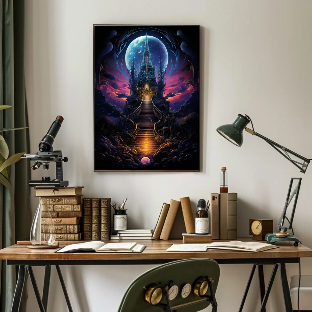 Step into a world of fantasy with Moonlit Enchantment, a mesmerizing artwork that centers a mystical castle beneath a radiant full moon. Surrounded by swirling clouds and celestial bodies, the glowing entrance invites curiosity and discovery. The ethereal atmosphere and vibrant colors awaken imagination, making it a captivating centerpiece for fans of celestial adventures and dreamlike fantasy art.