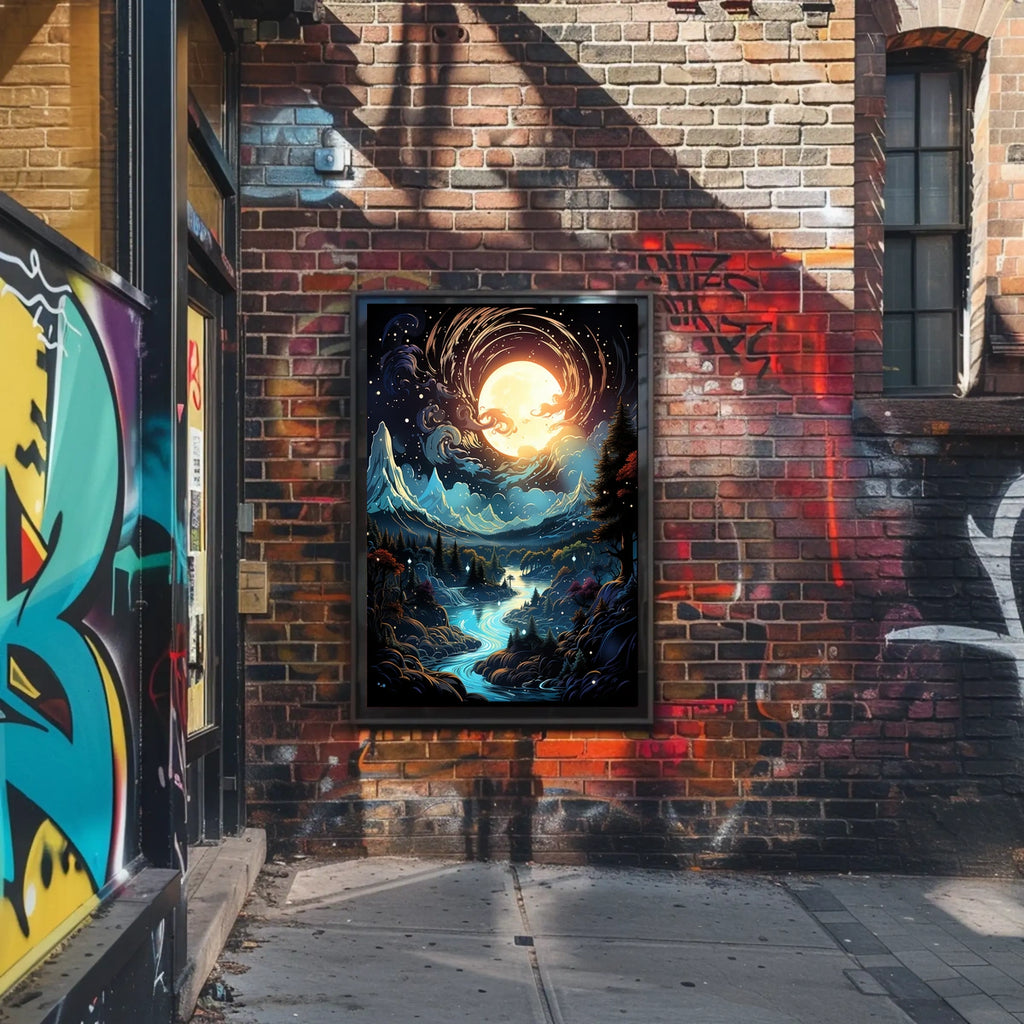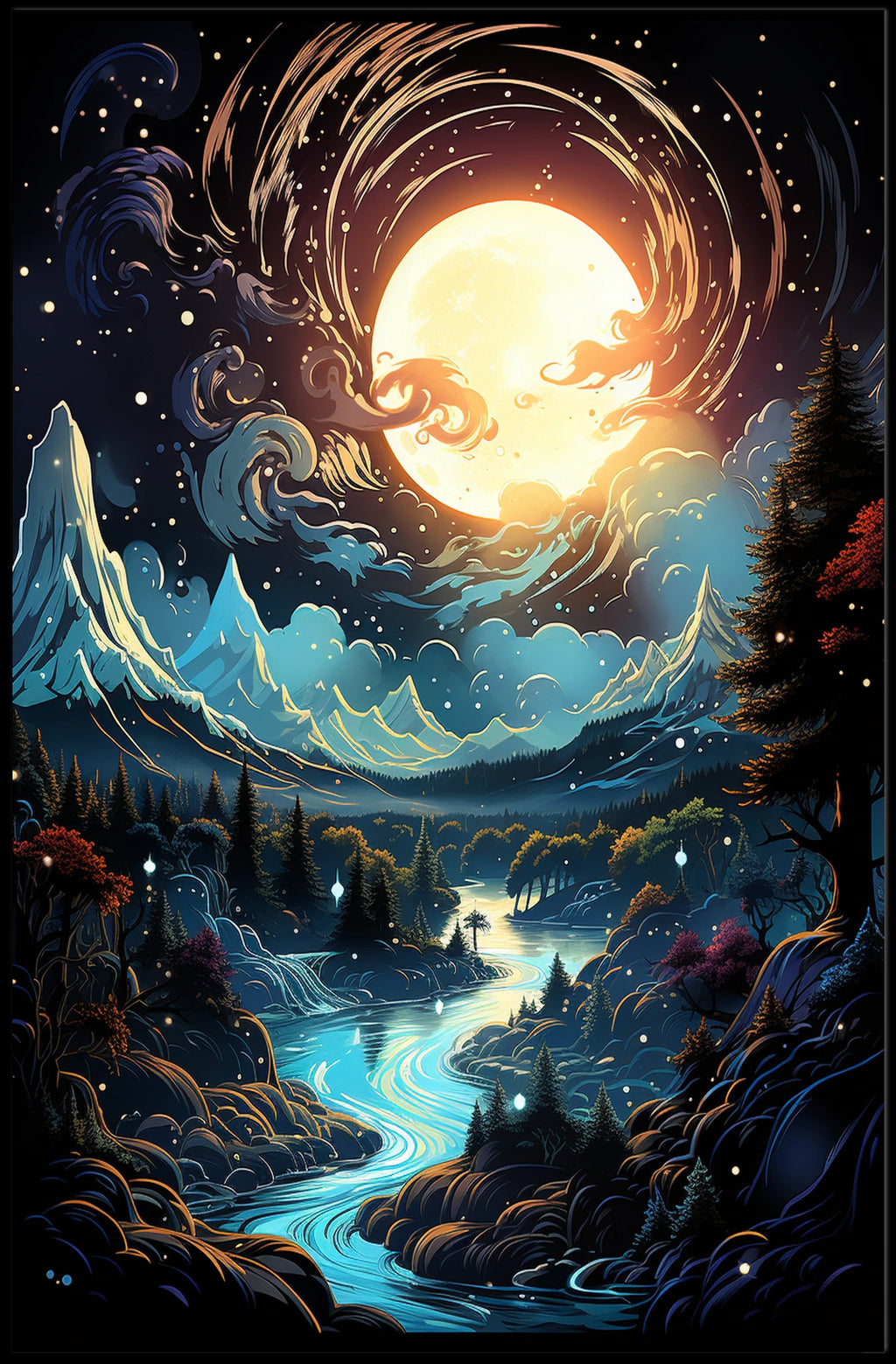 Immerse yourself in a fantastical nightscape with this captivating poster, featuring a serene landscape illuminated by a luminous moon. The scene unfolds with a tranquil river meandering through a mountainous forest, where snow-capped peaks rise majestically. Dense clusters of evergreen trees and vibrant flora line the riverbanks, while swirling clouds add movement to the starry sky. This vibrant, illustrative artwork, infused with surrealism, evokes a dreamlike mood of wonder and enchantment. Perfect for those seeking to bring a harmonious balance of nature and mysticism into their space, this piece is a testament to ethereal beauty.