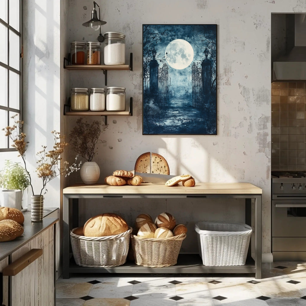 Bring a hauntingly beautiful scene into your home with the Moonlit Gateway Poster by PosterGoat. This evocative wall art captures a luminous full moon suspended above ornate iron gates and flanked by weathered stone pillars and vintage lanterns — a minimalist, scenic print perfect for decor lovers and wanderlust spirits alike.