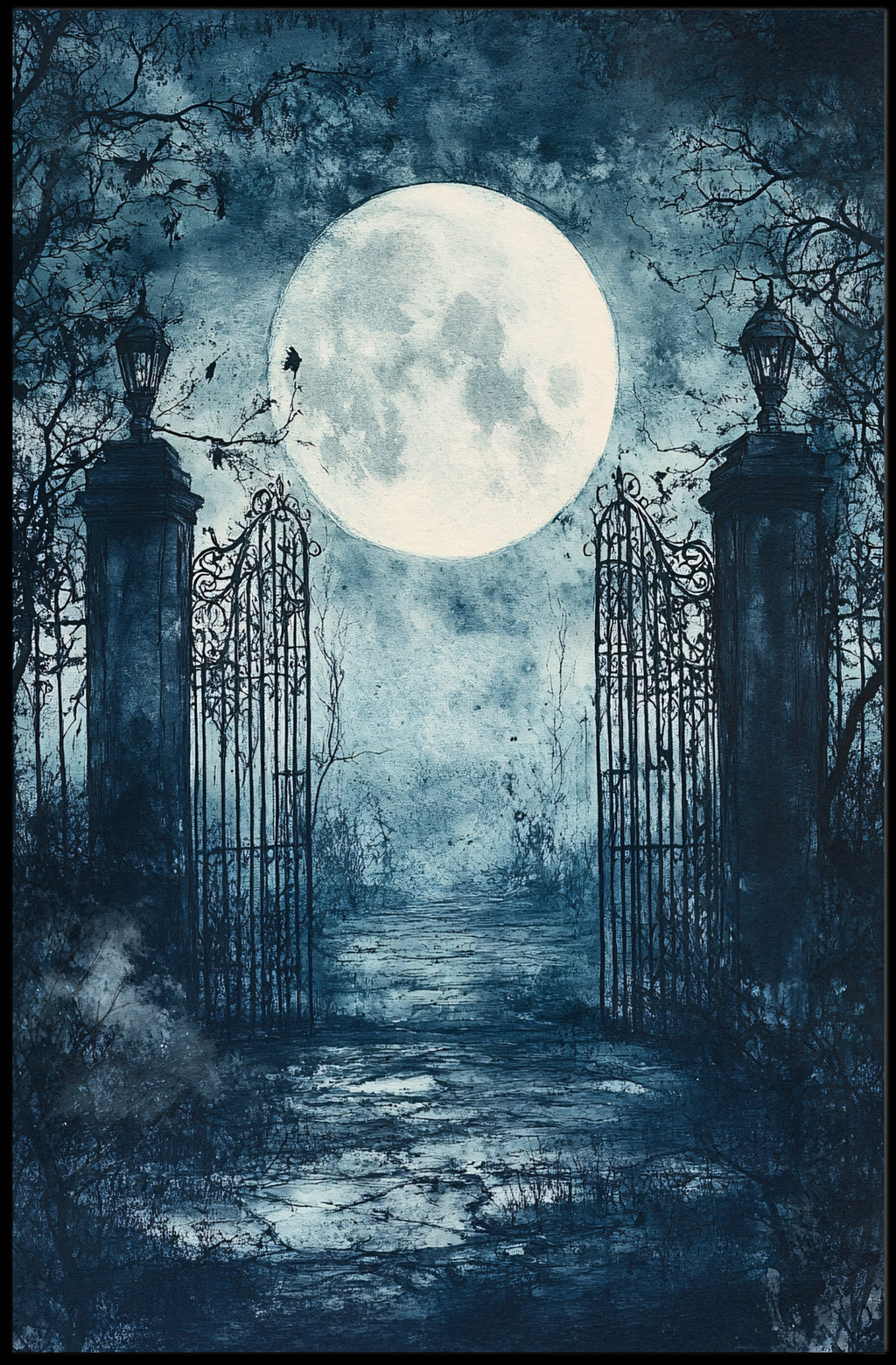 Detailed composition: Intricate wrought-iron gates, leafless branches, misty pathway textures and a glowing full moon deliver cinematic, story-driven visuals.