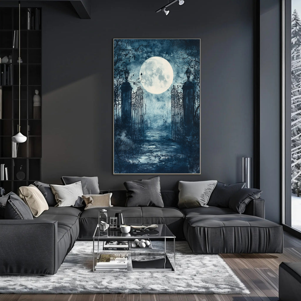 Atmospheric design: Deep indigo and icy blue tones create a moonlit, slightly eerie mood that works as striking focal art for living rooms, bedrooms, or hallways.