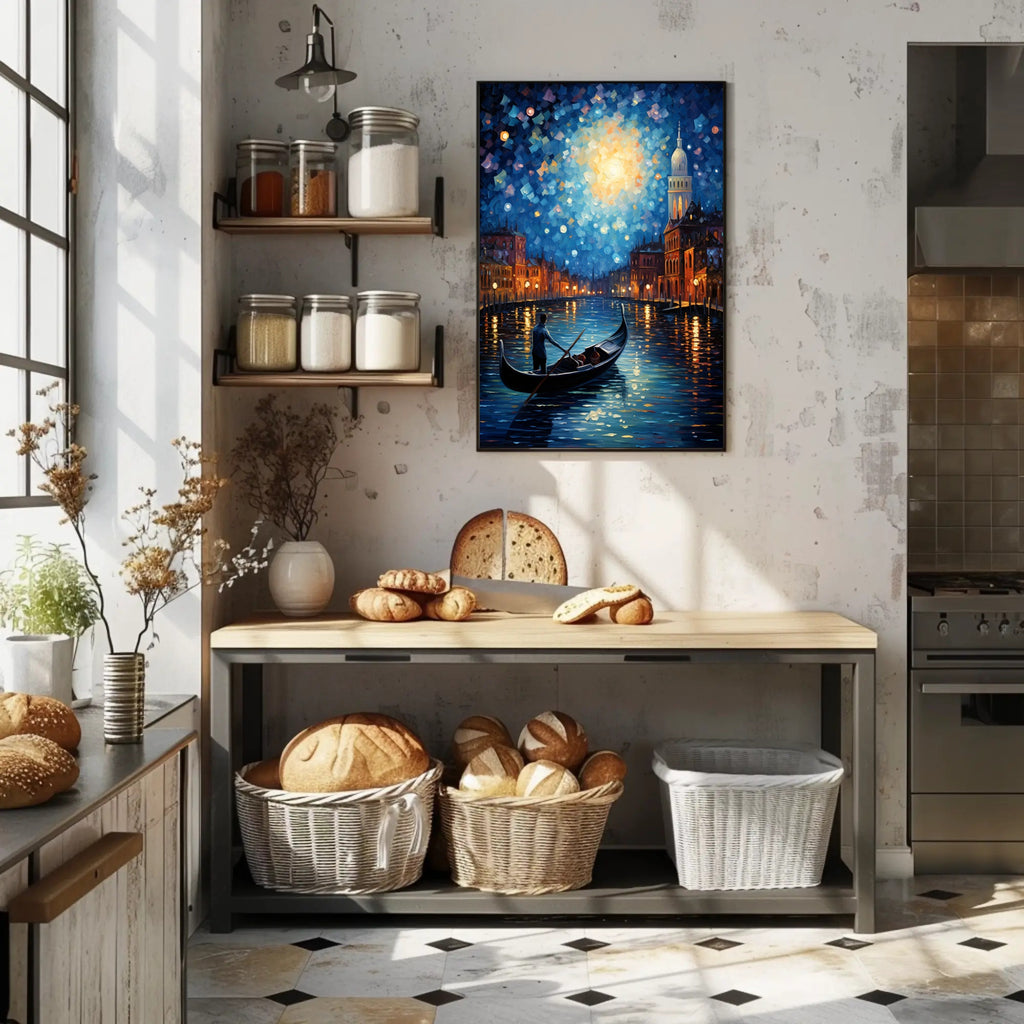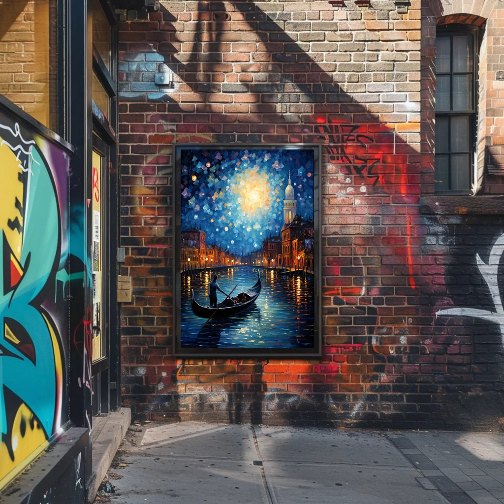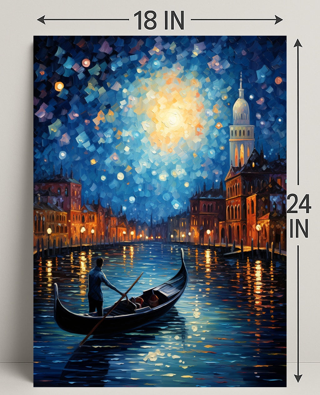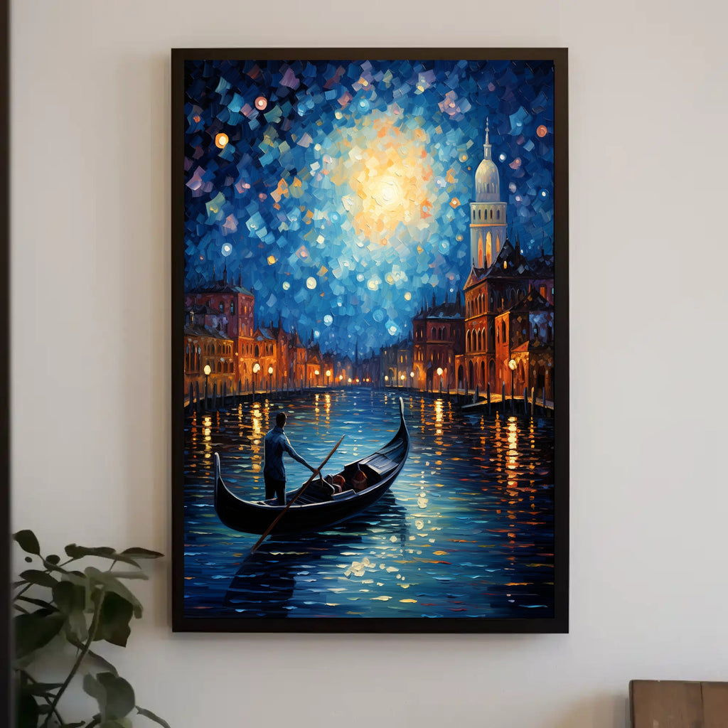 Perfect for gifting or creating a serene focal point on any wall, the Moonlit Gondola Ride Poster brings a touch of wanderlust and timeless elegance to your space.
