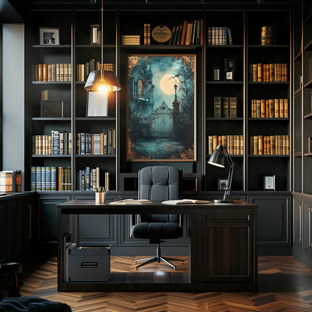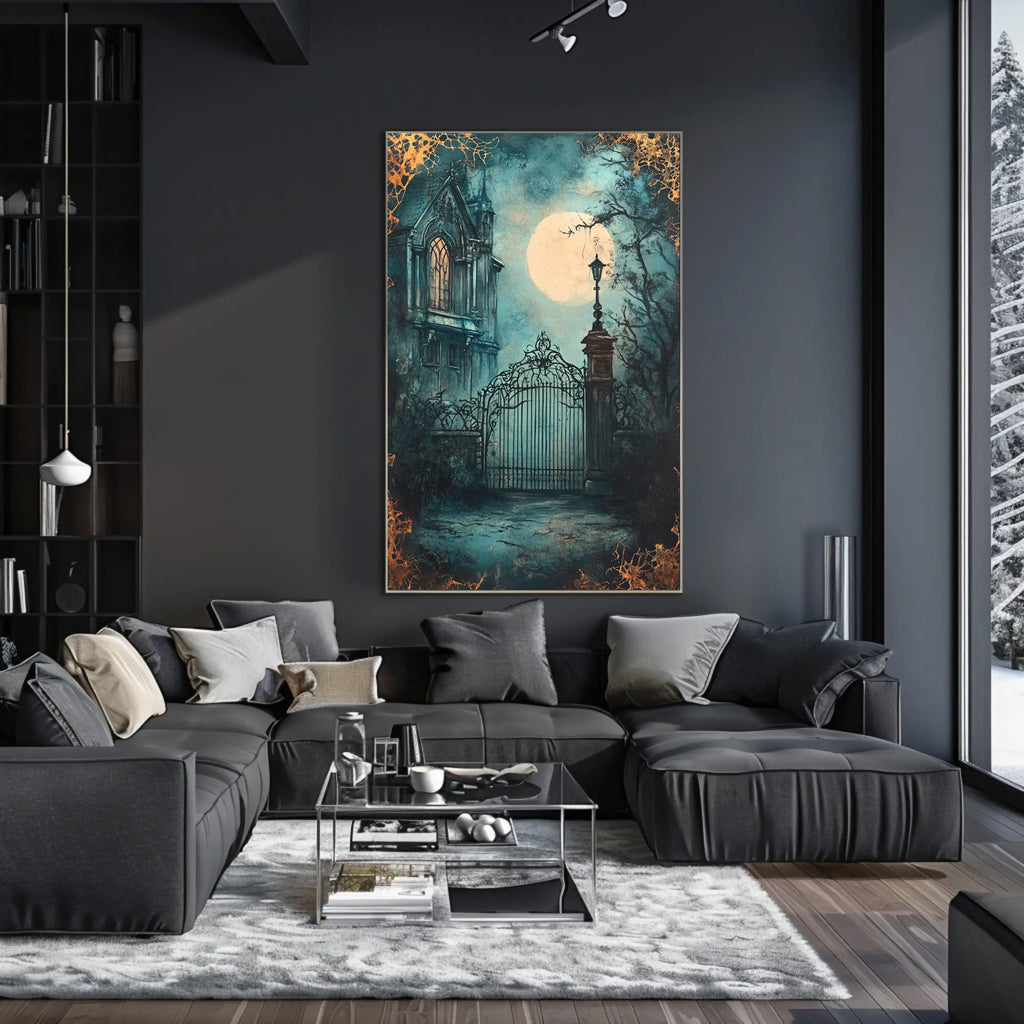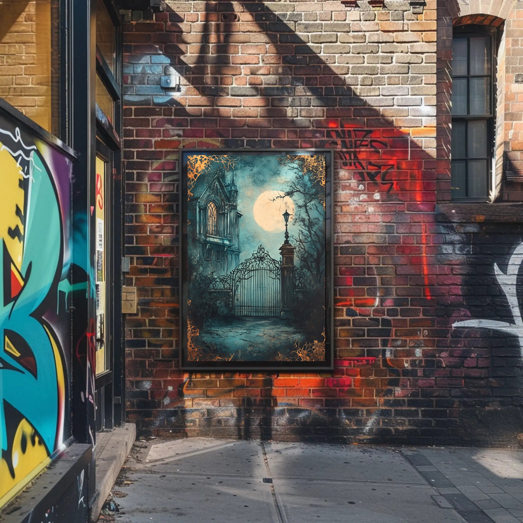 Enhance any wall with this hauntingly beautiful poster that blends scenic storytelling and vintage collage style—order your Moonlit Gothic Gate Poster from PosterGoat today and make a timeless statement in your space.