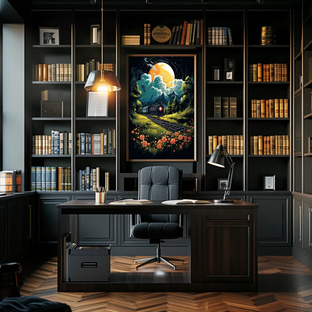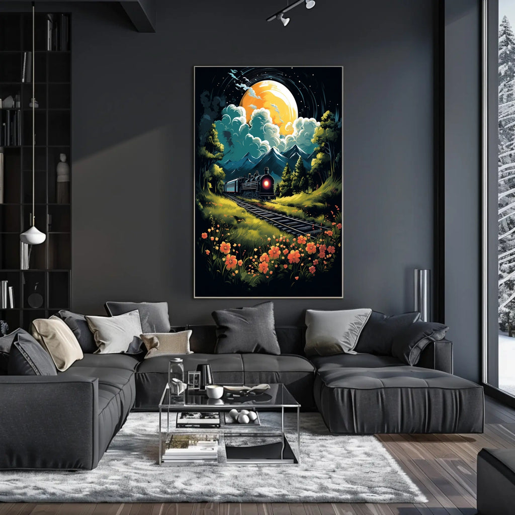 Immerse yourself in the enchanting allure of a vintage train journey through a vibrant, flower-filled meadow bathed in the glow of a luminous full moon. This artwork captures the magic of night travel, inviting mystery, romance, and imagination into any space.