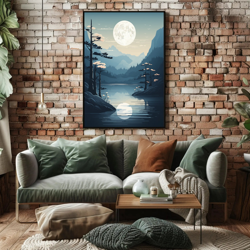 Moonlit Mountain Serenity Poster by PosterGoat brings calm and wonder to any room with a minimalist, nature-inspired scene that captures a luminous full moon hovering above layered mountain silhouettes and a glassy lake.