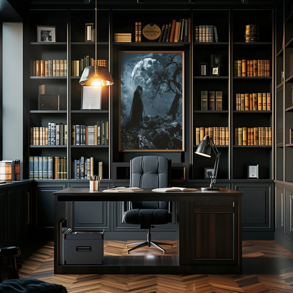 The Moonlit Reaper Poster makes a bold statement as a centerpiece or a complementary piece in a curated gallery wall—an unforgettable gift for lovers of mystical design, haunting visuals, and scenic wall art. Order now from PosterGoat and bring moonlit mystery to your space tonight.