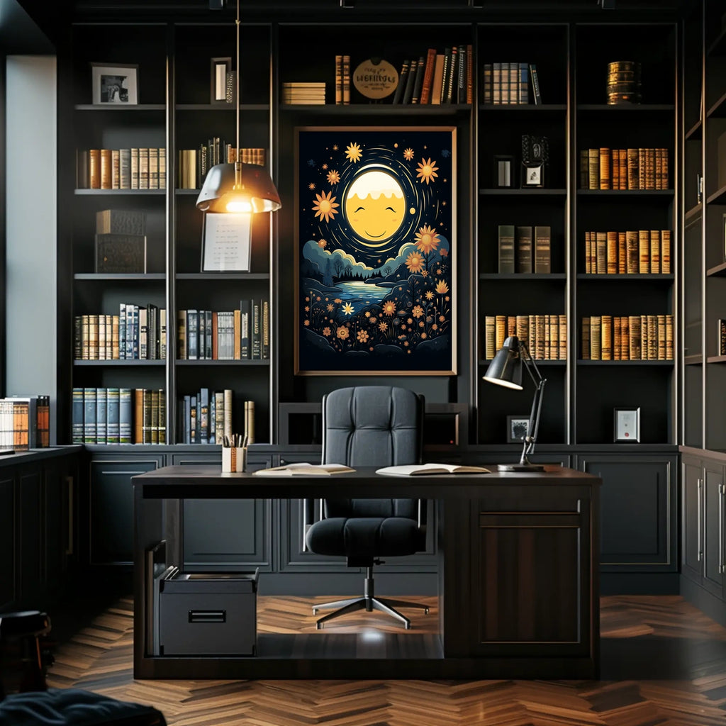 Moonlit Serenity invites you into a whimsical night scene where a smiling moon casts a gentle glow over a tranquil landscape. Surrounded by blooming flowers and twinkling stars, this whimsical art captures nature harmony and the serene beauty of a magical night, adding peaceful charm to any space. Ideal for living rooms, bedrooms, or study corners, it elevates decor with a tranquil, dreamlike vibe.