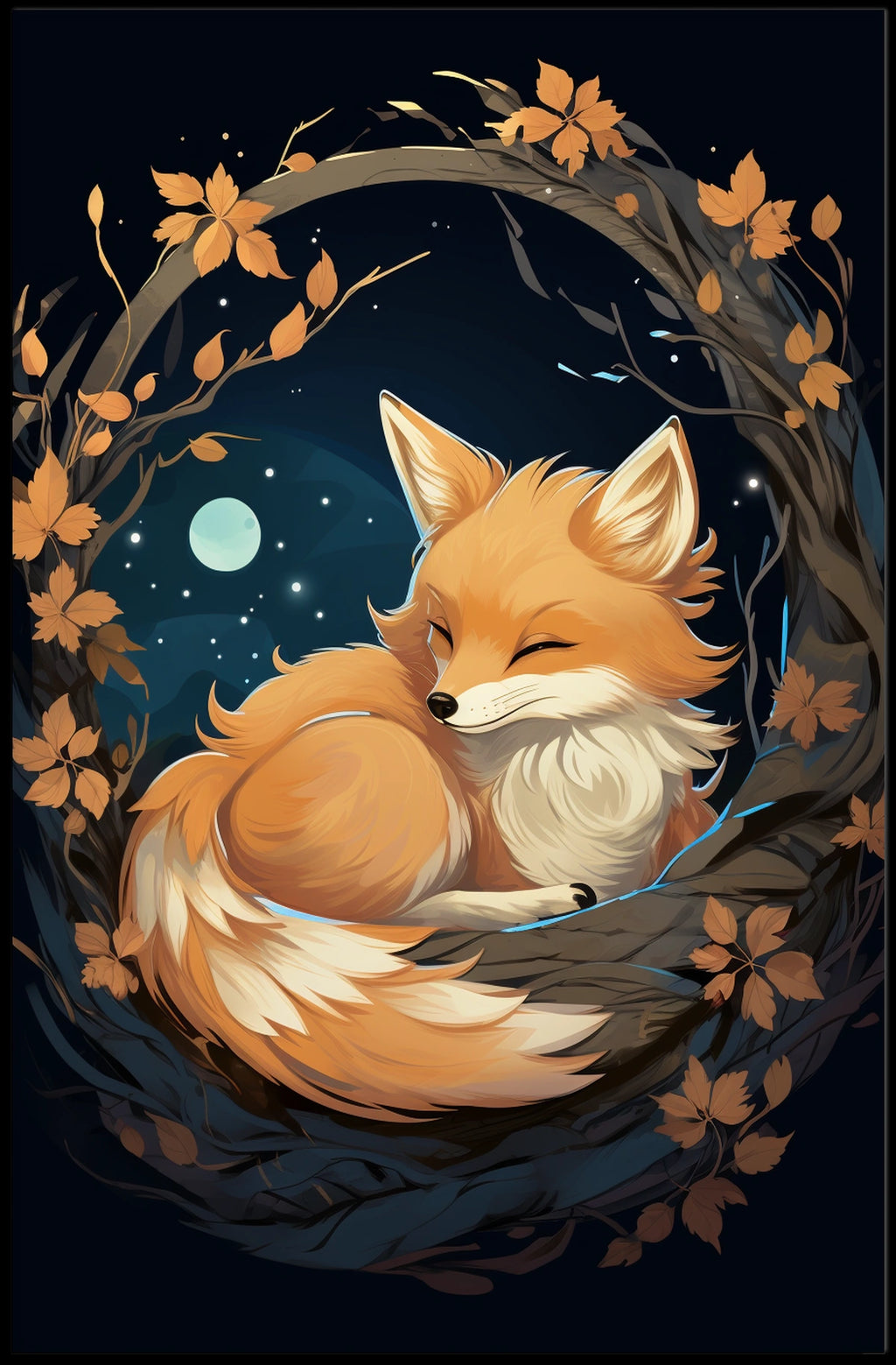 Experience Moonlit Serenity, a calming illustration that captures a peaceful fox nestled within a wreath of autumn leaves beneath a starry night. This artwork invites you to pause, breathe, and embrace nature's quiet beauty that soothes any space.