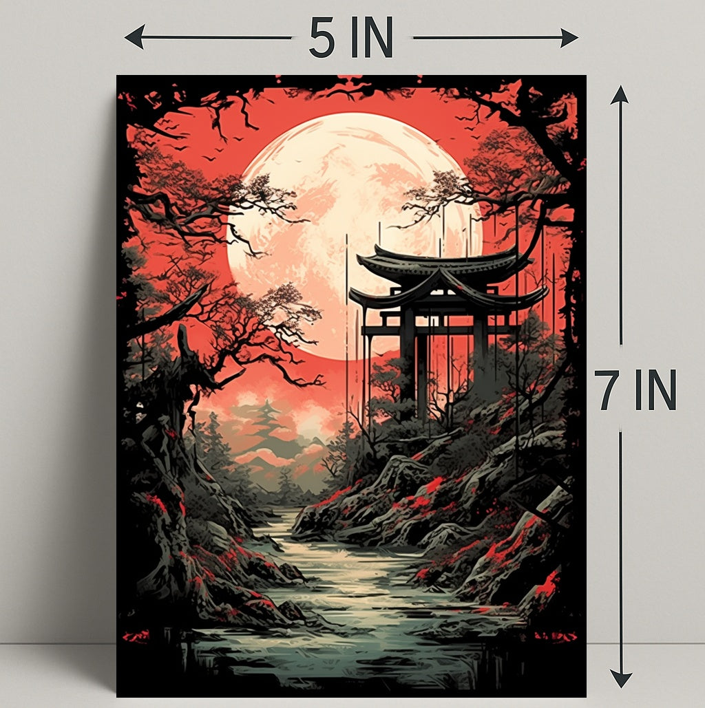 Bring calm and cinematic drama to your walls with the Moonlit Tranquility Poster from PosterGoat — a minimalist, artful print that captures a moon-drenched valley, a traditional torii silhouette and a winding river framed by gnarled trees and rocky cliffs. The oversized moon and limited palette of deep reds, soft creams and shadowed greens create a striking focal point that works beautifully in living rooms, bedrooms, offices or gallery-style decor.
