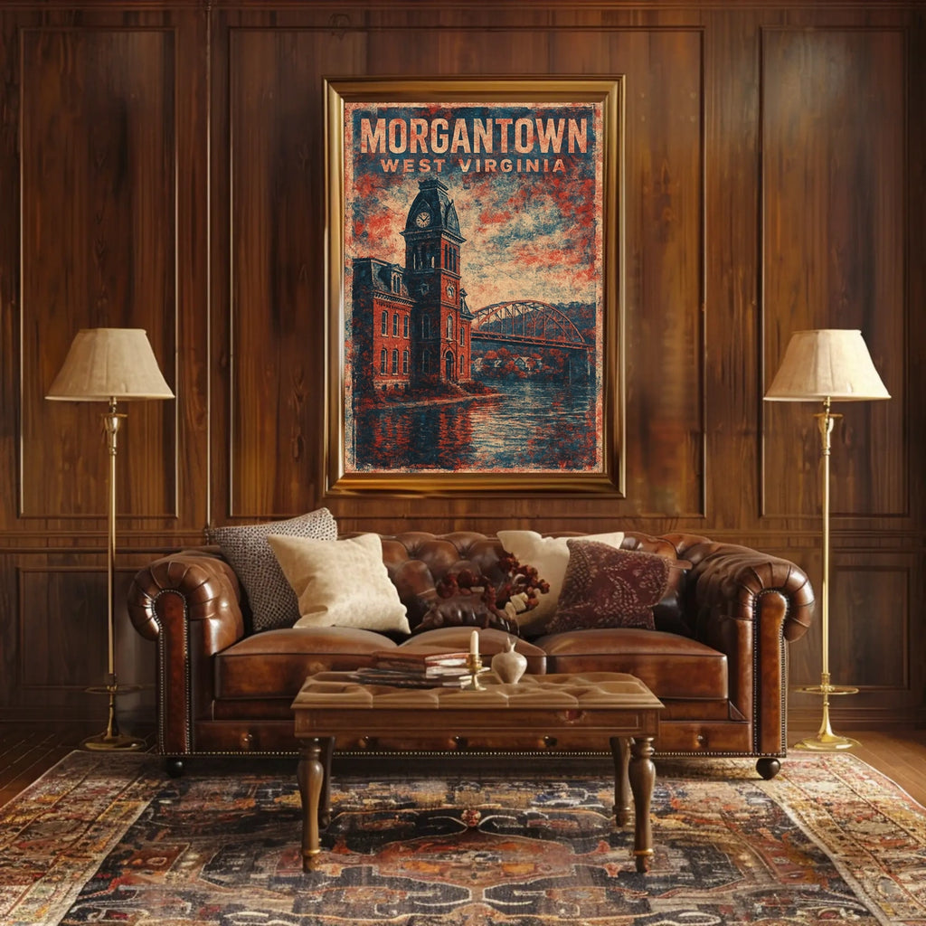 Celebrate Morgantown Clock Tower and River Vintage Travel Poster, a timeless window into Morgantown, West Virginia. This captivating vintage poster features a historic clock tower standing beside a shimmering river, with an elegantly arched bridge spanning the waterway. The serene townscape backdrop is dotted with charming buildings, all rendered in a muted color palette dominated by reds and blues that evoke nostalgia and the spirited essence of American small-town architecture.