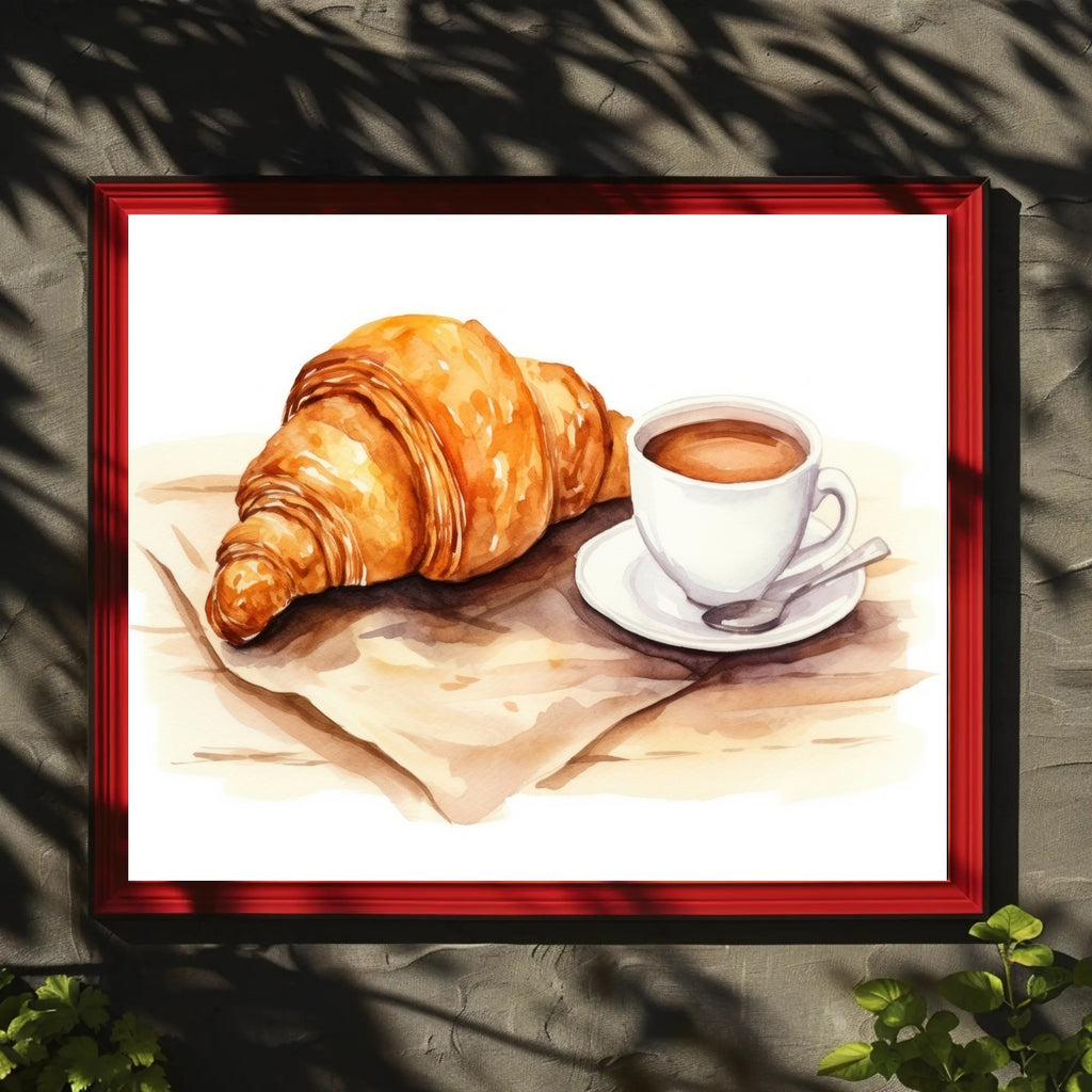 Invite a gentle, sunlit morning into your home with the Morning Delight Poster by PosterGoat. This minimalist, watercolor-style art print captures a golden croissant resting on parchment beside a steaming cup of coffee — rendered in warm, appetizing tones that create an instant cozy atmosphere. Perfect for kitchens, dining nooks, cafés, or above your office coffee station, this piece elevates everyday moments with serene imagery and tasteful composition.