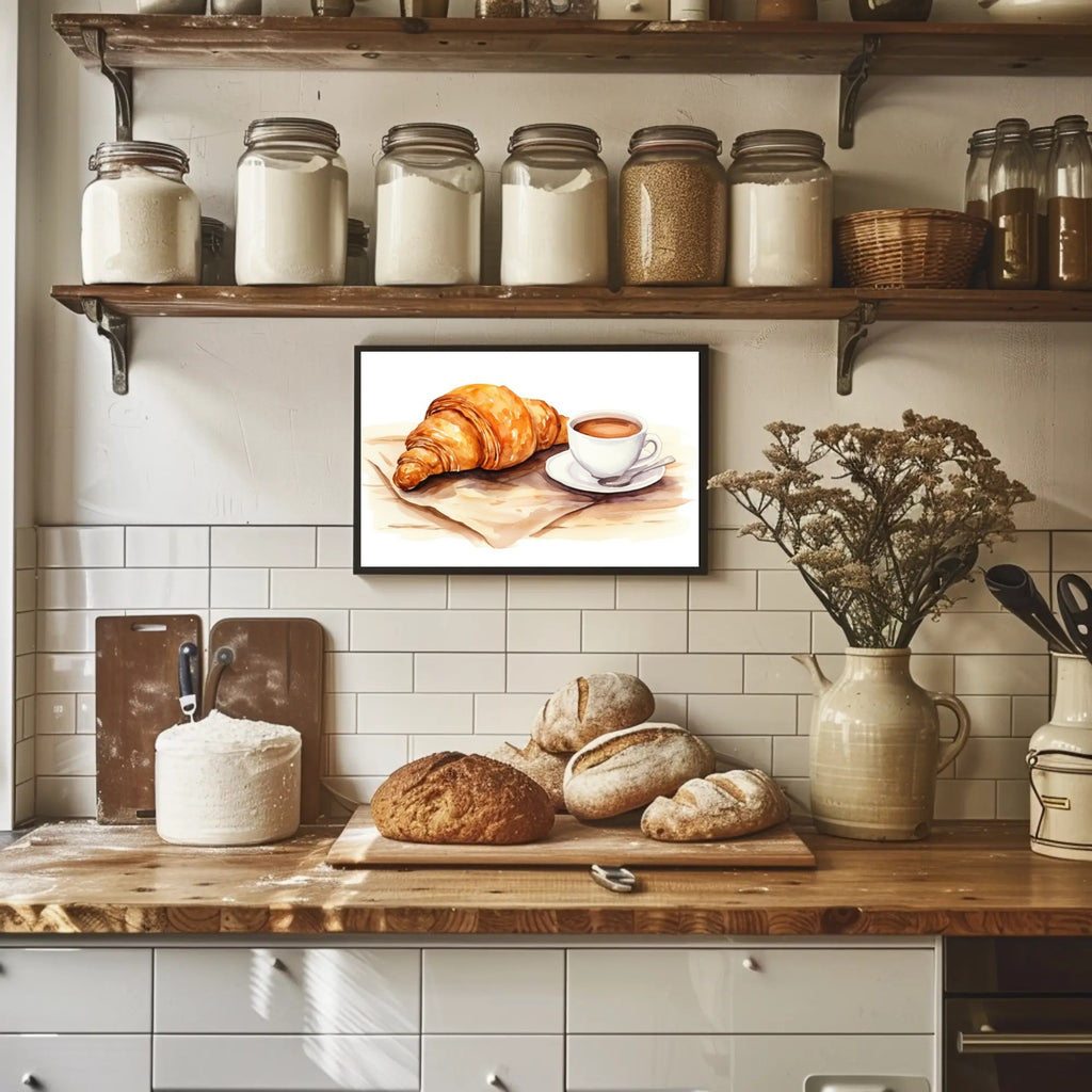Key motifs: Croissant art, coffee decor, breakfast art — evokes a relaxed, European-café morning.