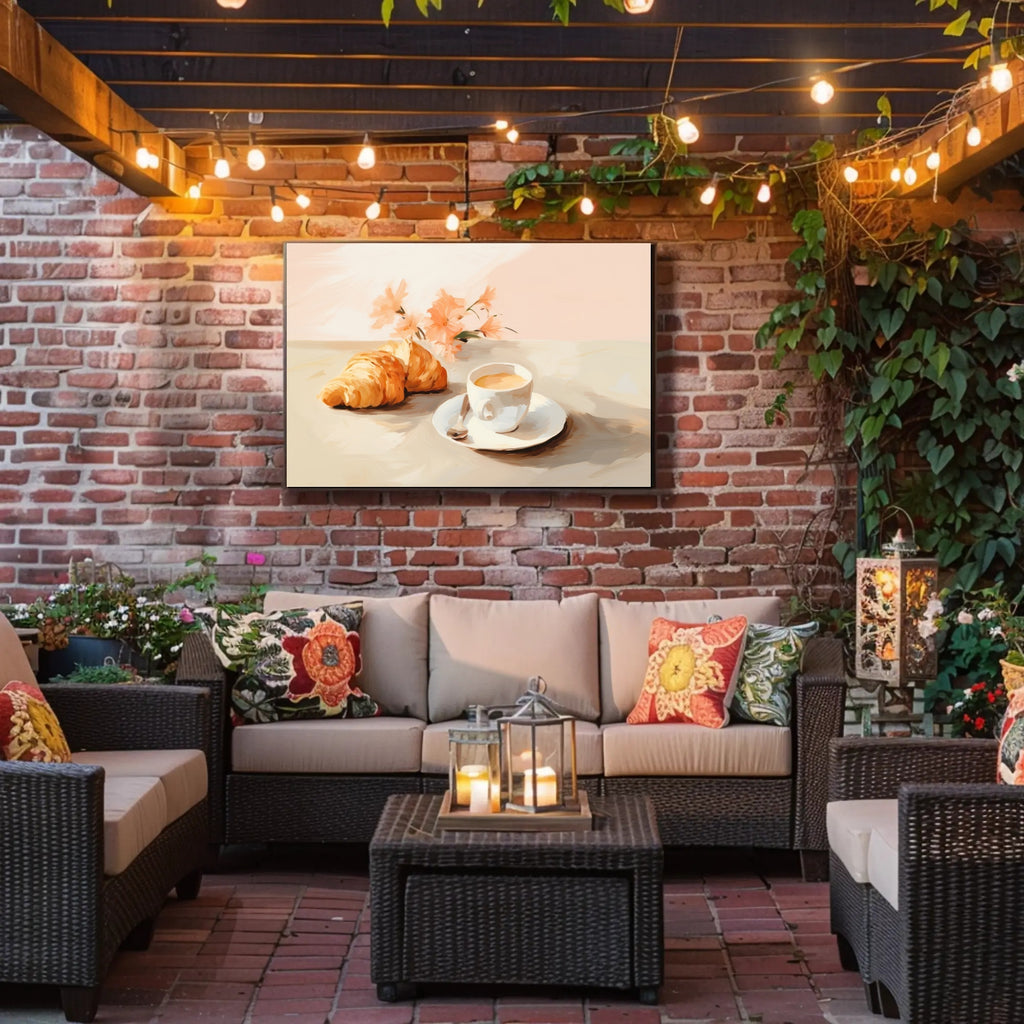 Invite the calm of a sunlit morning into your home with the Morning Elegance Poster from PosterGoat. This minimalist art print captures a painterly coffee scene — a steaming cup, a flaky croissant and delicate peach blooms — rendered in soft, warm tones that create a serene focal point for any room.
