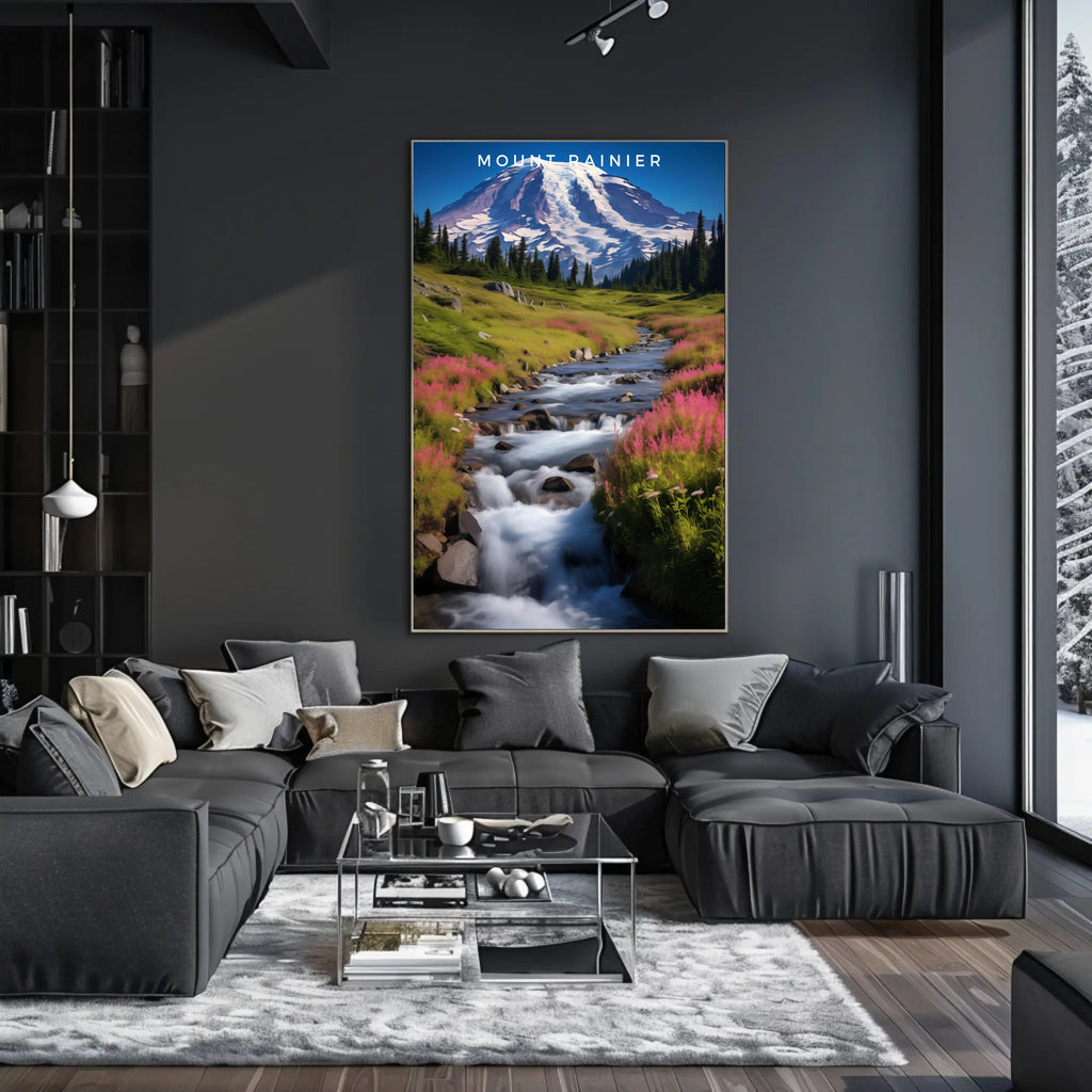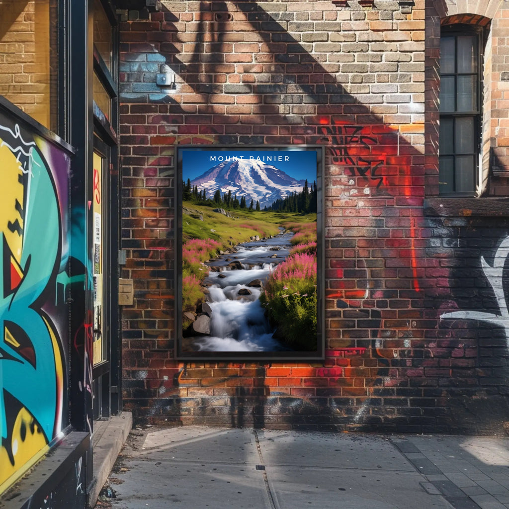 Bring the Pacific Northwest into your space. This Mount Rainier Vintage Travel Poster from PosterGoat captures the towering, snow-capped peak and a crystal alpine stream winding through mossy meadows dotted with vivid pink wildflowers—rendered in a rich, painterly, vintage-inspired style that feels both nostalgic and modern.