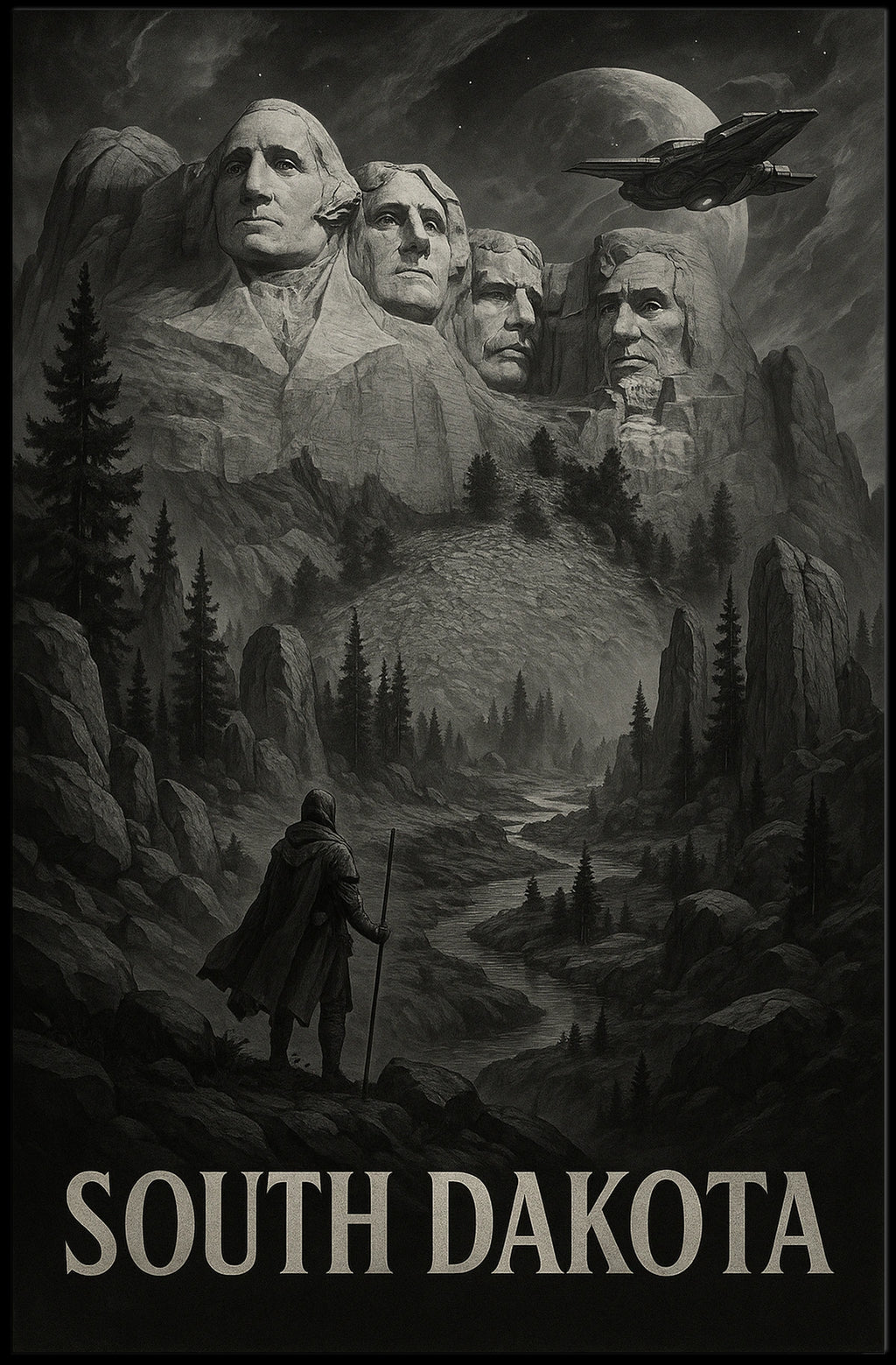 Detailed design highlighting the iconic Mount Rushmore silhouette reimagined with dreamlike fantasy scenery