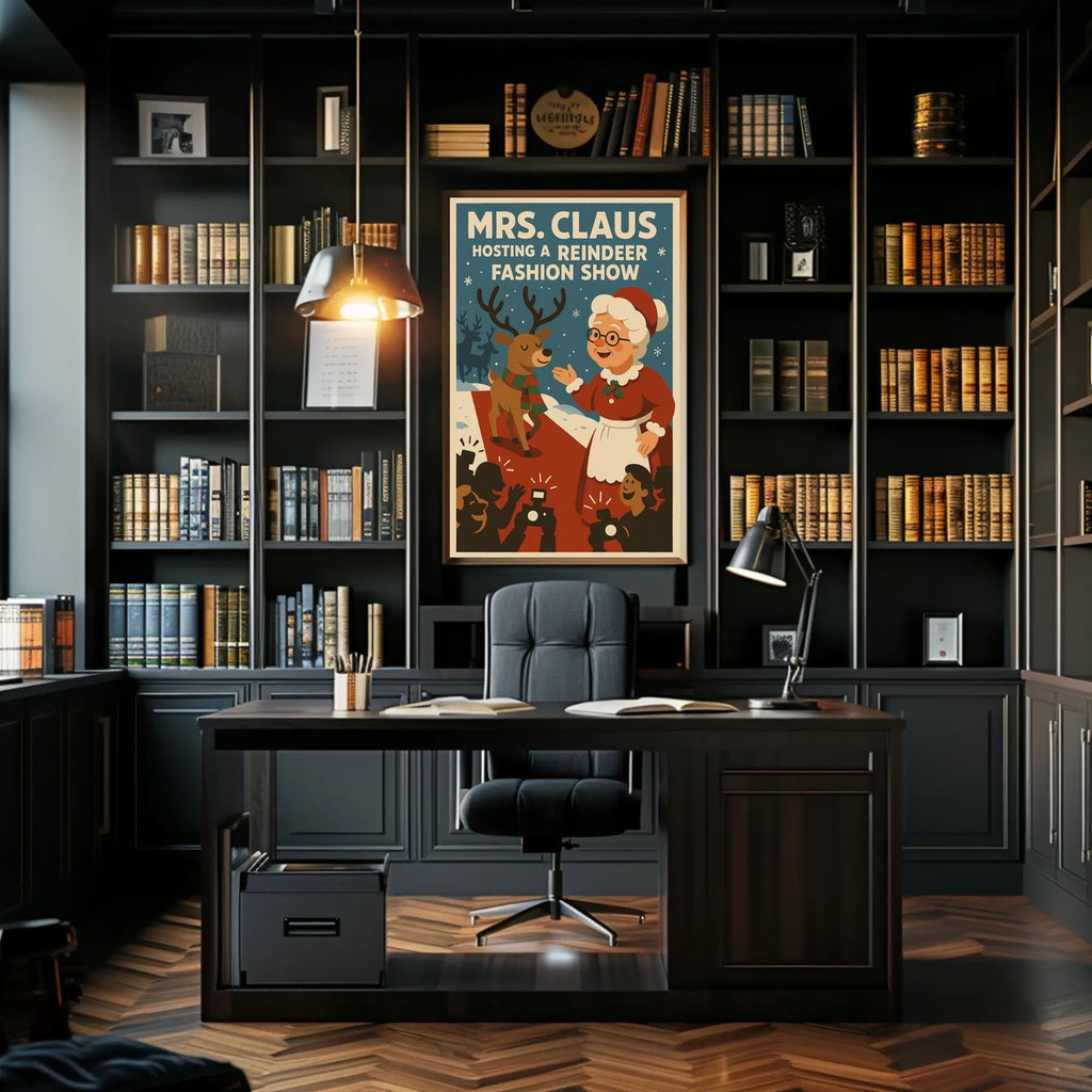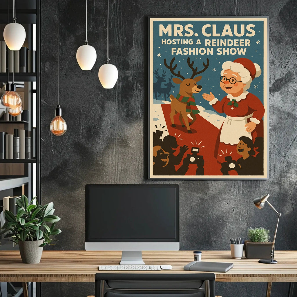 Mrs. Claus Hosts a Reindeer Fashion Show Poster celebrates the beauty of festive storytelling in wall art. This poster captures the essence of Mrs. Claus Hosts a Reindeer Fashion Show, designed for decor lovers and wanderlust spirits. It adds charm to any room with visuals inspired by real-world scenery.