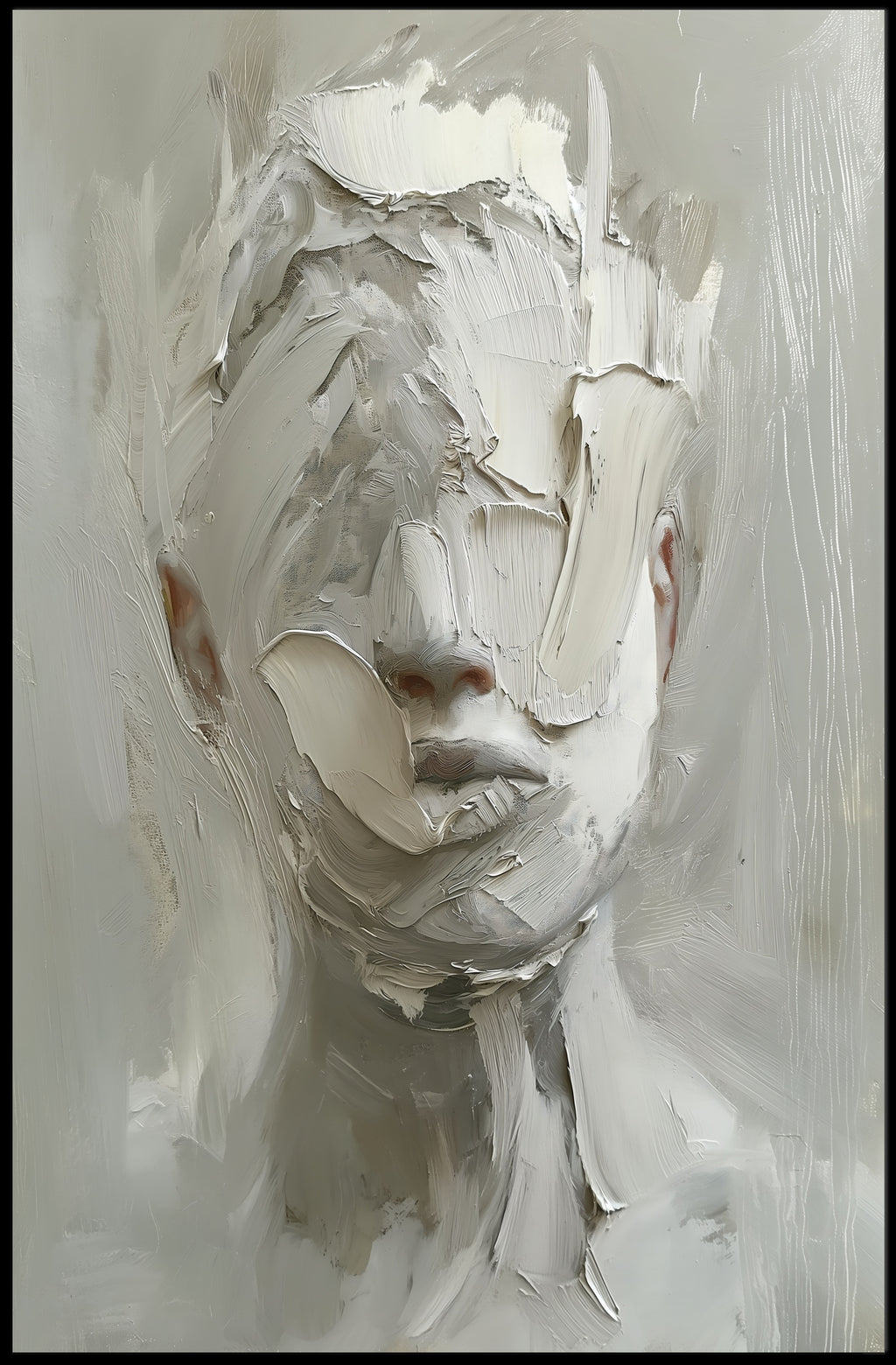 This captivating poster presents an enigmatic and abstract portrayal of a human face, crafted with lavish and expressive brushstrokes. The artwork's heavy use of white and gray paint creates a textured, sculptural quality, inviting viewers to explore its modern, impressionistic design. The piece eschews detail in favor of form and texture, resulting in an evocative, contemplative mood. The absence of identifiable features or characters enhances its mystery and artistic allure. Perfect for adding intrigue to any space, this poster is a testament to the power of impressionistic expression in contemporary art.