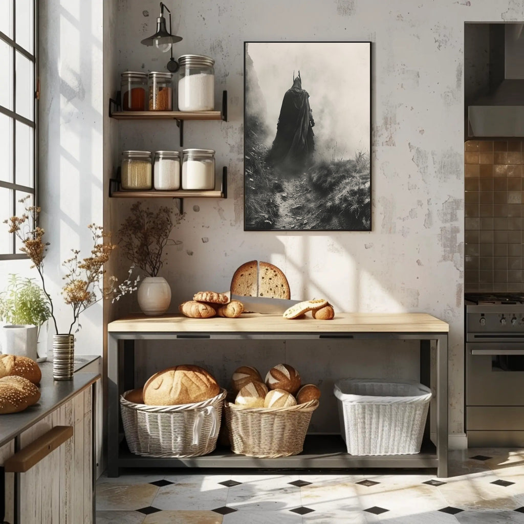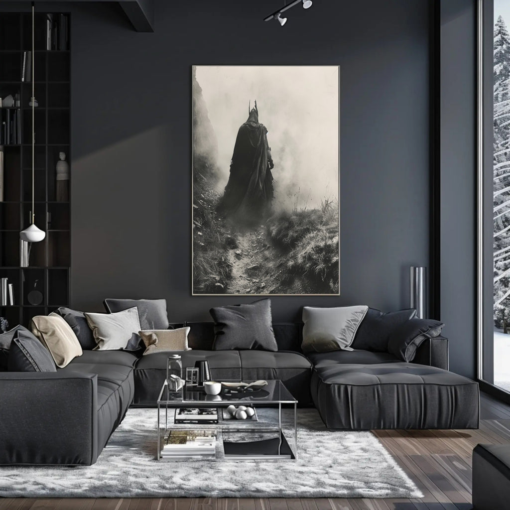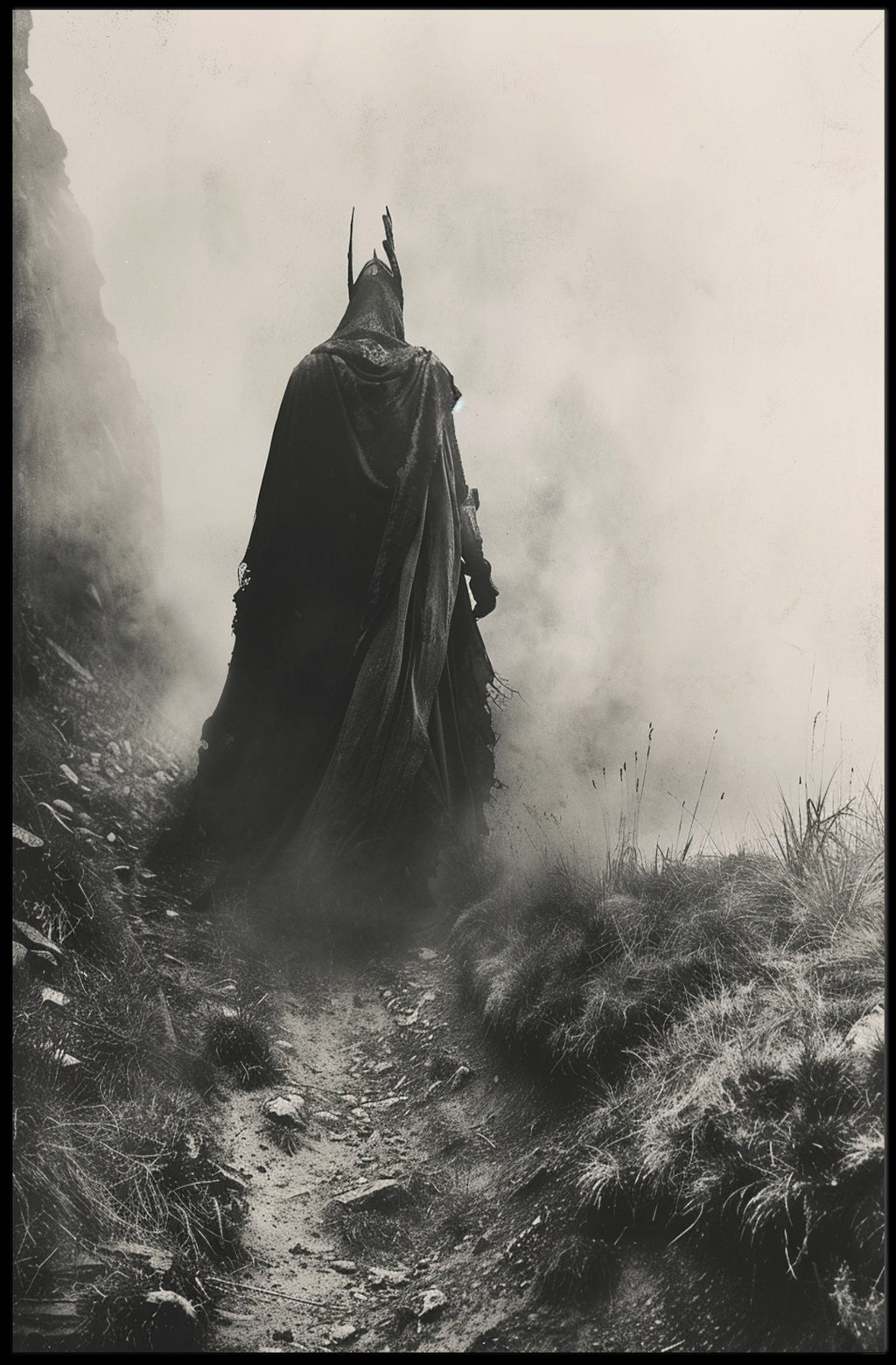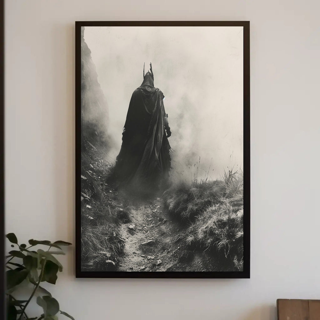 Invite mystery into your space with the Mysterious Cloaked Figure in Foggy Terrain Fantasy Poster from PosterGoat. This photorealistic, monochromatic artwork captures a lone, cloaked character emerging from mist along a rugged path—an evocative scene that blends medieval atmosphere with modern high-contrast design.