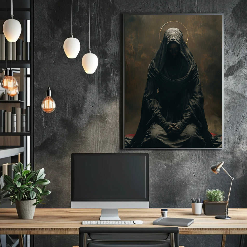 This minimalist yet dramatic poster blends classical religious motifs with modern dark art sensibilities. The cloaked figure sits in stillness, hands clasped, inviting introspection and conversation. The finely detailed fabric folds, moody shadows, and restrained color palette make this piece a standout addition to living rooms, studies, galleries, or meditation spaces.