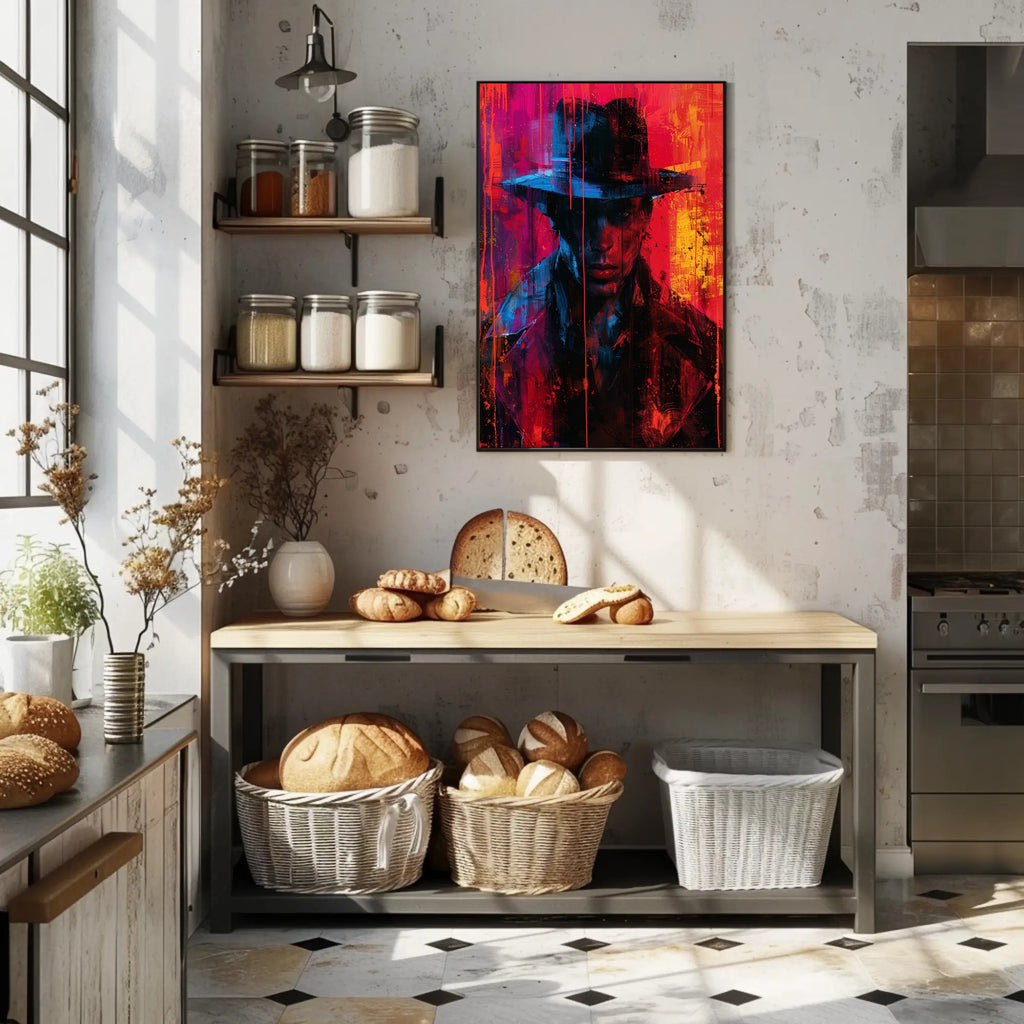 Mysterious Figure in Vivid Colors Poster — a striking pop-art poster from PosterGoat that transforms any wall into a bold statement. This evocative print blends neon reds, electric blues, and warm oranges to outline an enigmatic figure in a wide-brim hat, creating a cinematic focal point for modern interiors and creative spaces.