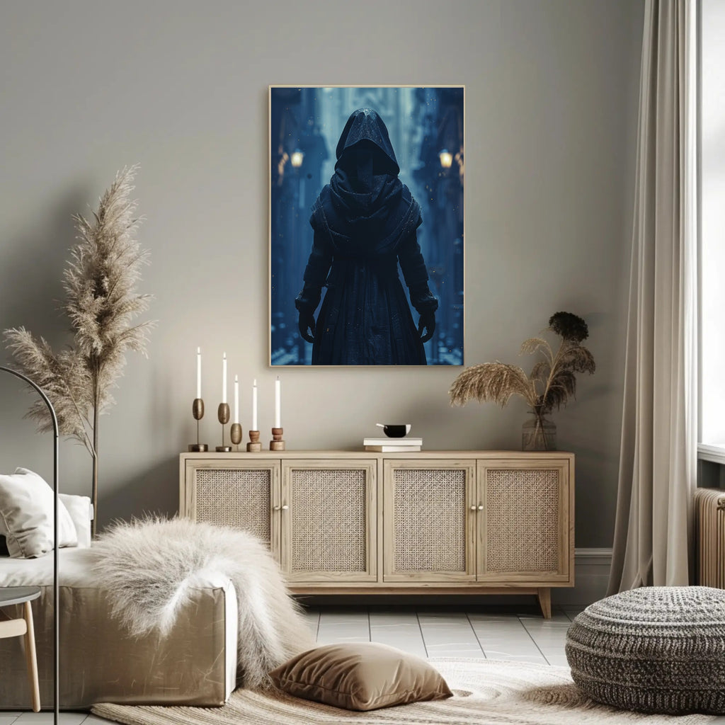 Mysterious Hooded Figure in Fantasy Alleyway Poster by PosterGoat transforms any wall into a cinematic gateway to a dark, medieval realm. This atmospheric poster captures a hooded silhouette standing in a misty alley, framed by glowing street lamps and soft flecks of light — a photorealistic scene that draws the eye and sparks the imagination.