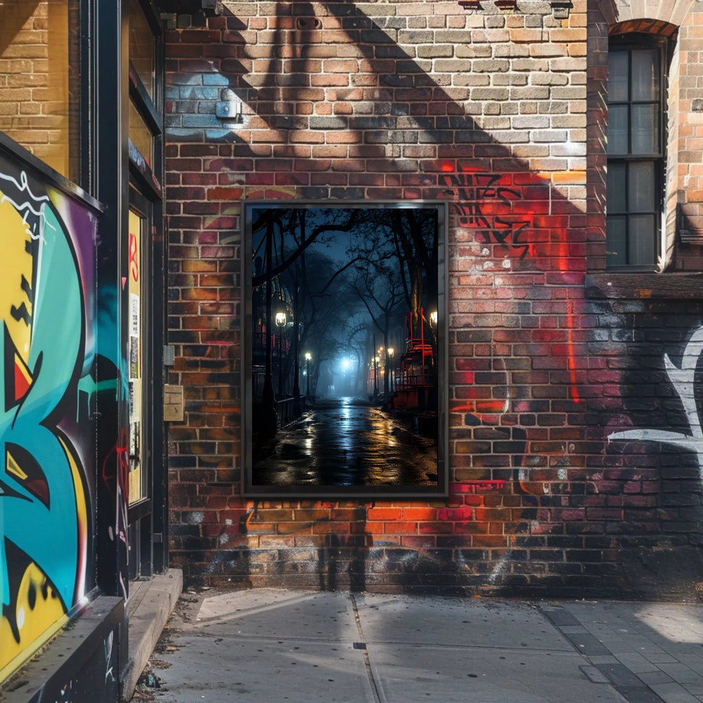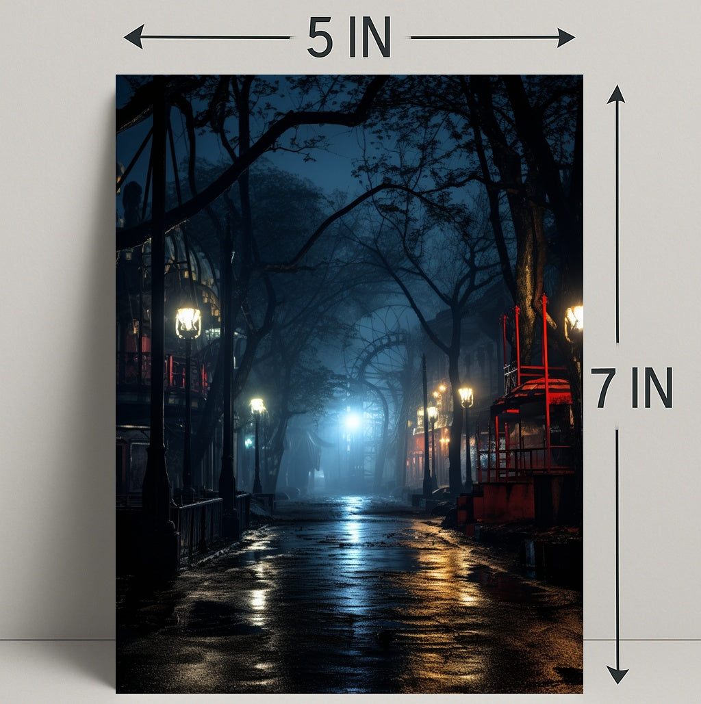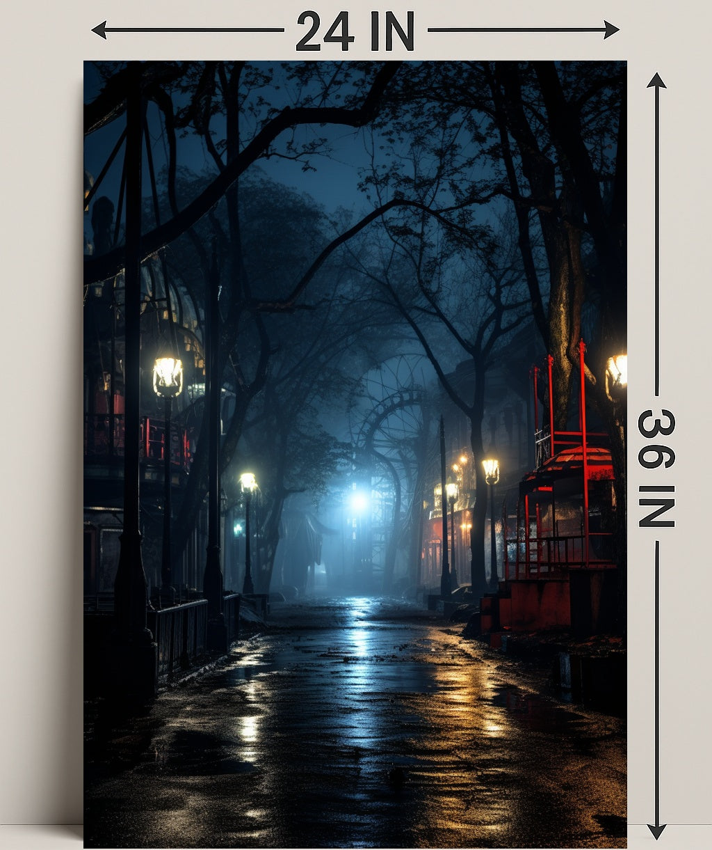 Immerse your space in cinematic atmosphere with the Mysterious Night In The Park Poster from PosterGoat. This evocative poster captures a fog-laced park pathway at night — wet, reflective pavement, vintage lampposts casting warm halos, the skeletal silhouette of a Ferris wheel in the distance and bare trees arching overhead — creating a moody, minimalist scene that draws the eye and sparks the imagination.