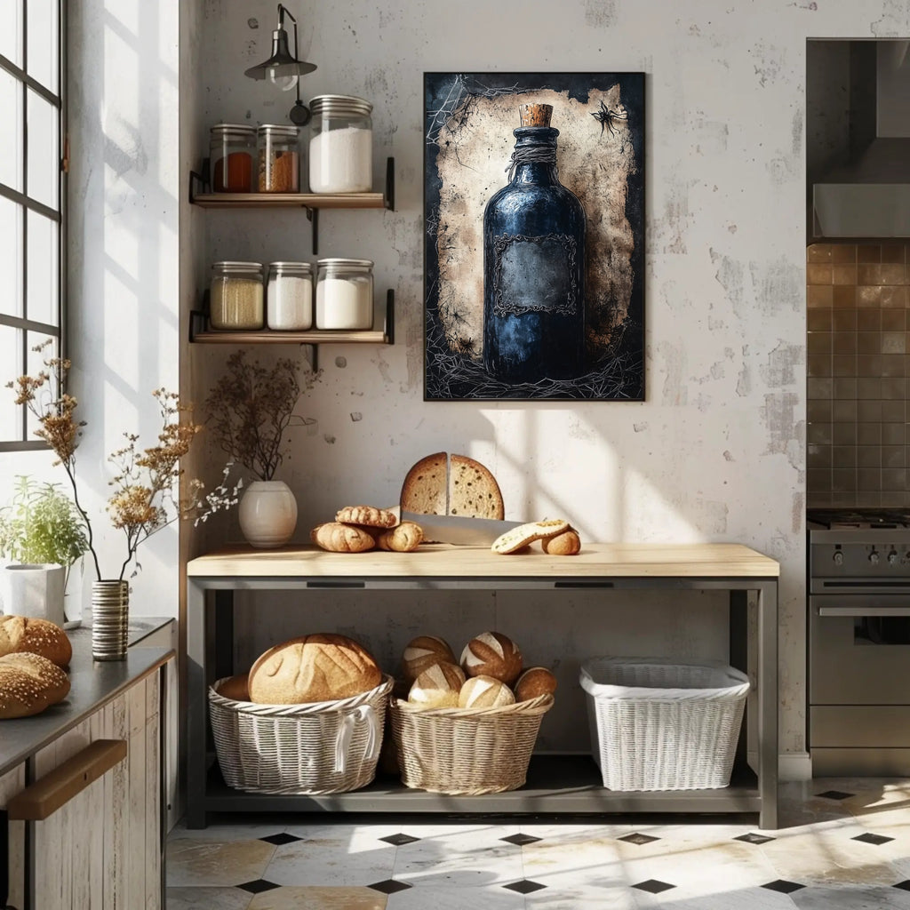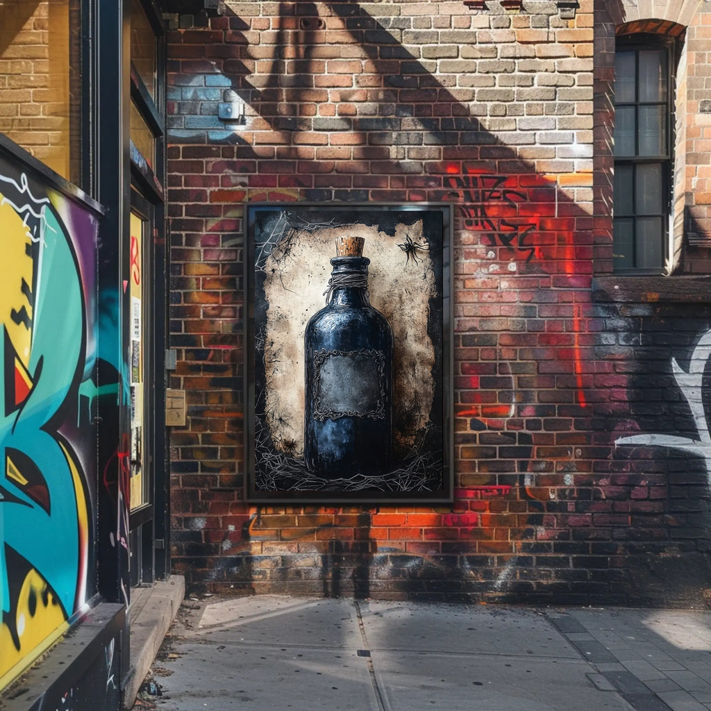 Striking photorealism: Rich textures and lifelike lighting give depth to the bottle’s worn glass and the distressed paper background, creating a dramatic focal point for any room.