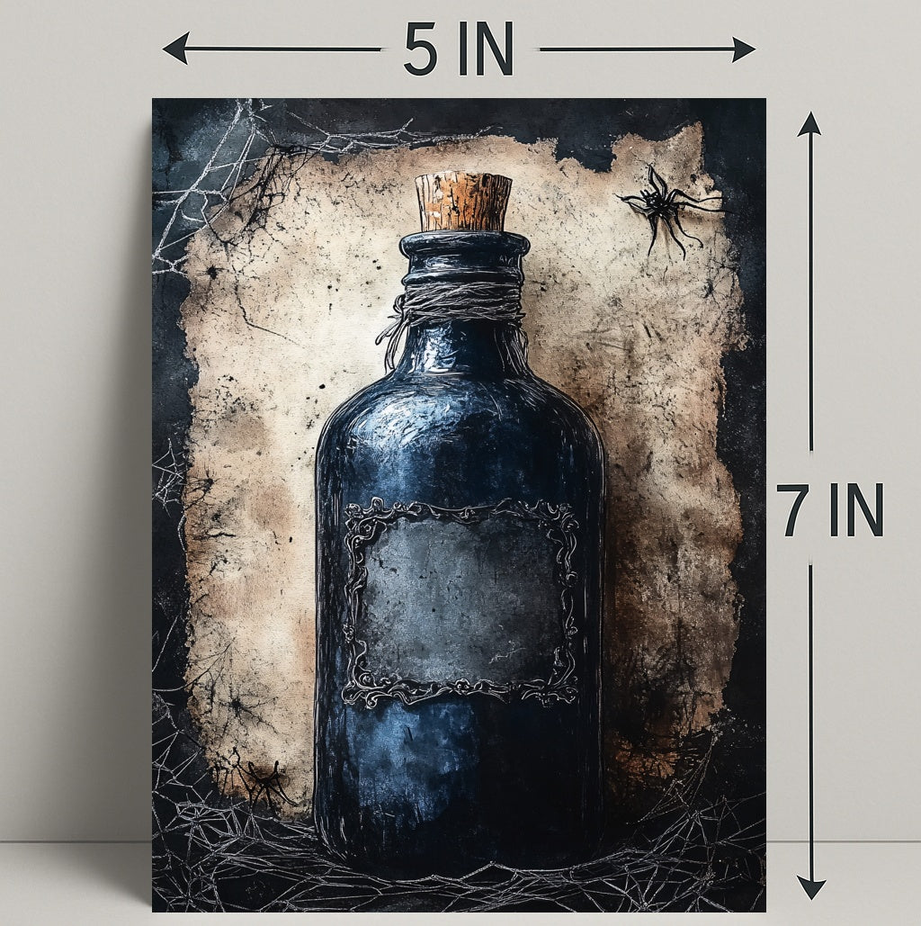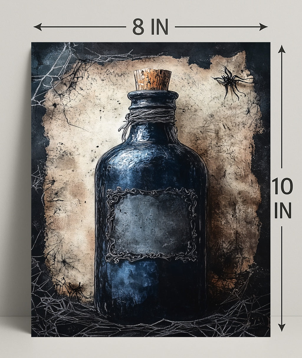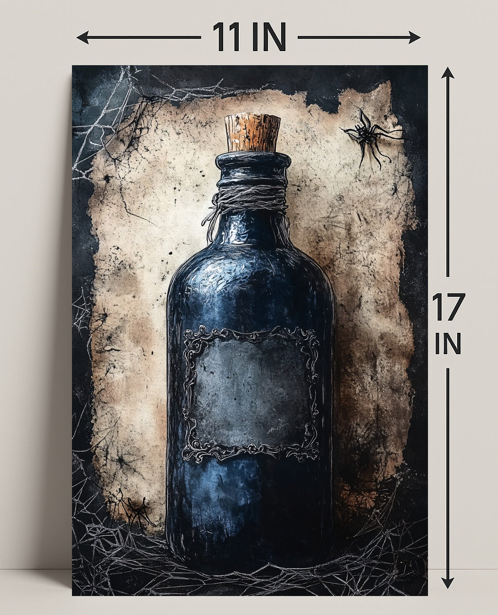 Bring a touch of dark intrigue to your walls with the Mysterious Potion Bottle Poster from PosterGoat. This photorealistic poster captures a weathered glass bottle sealed with a cork, wrapped twine at the neck, an ornate blank label, and delicate spiderweb accents against a grungy parchment backdrop — perfect for lovers of mysterious, Halloween-inspired wall art.