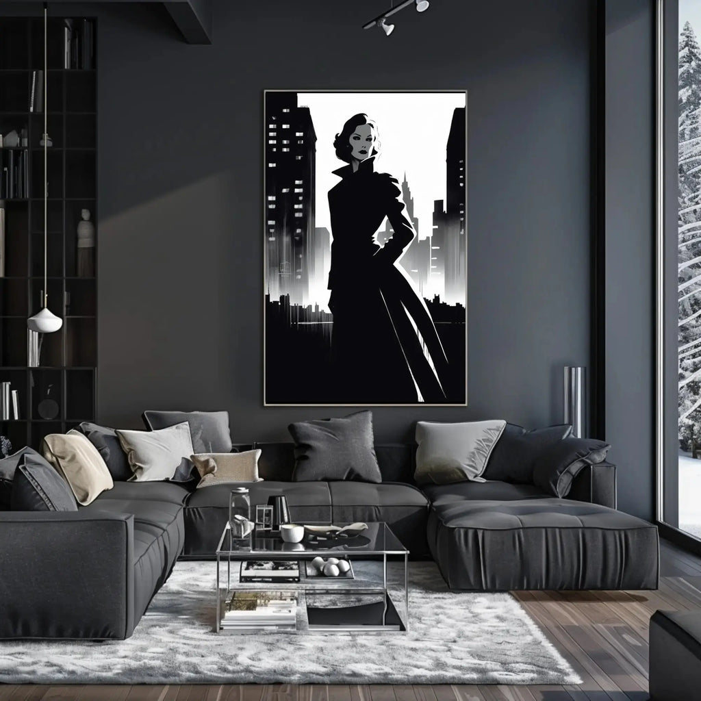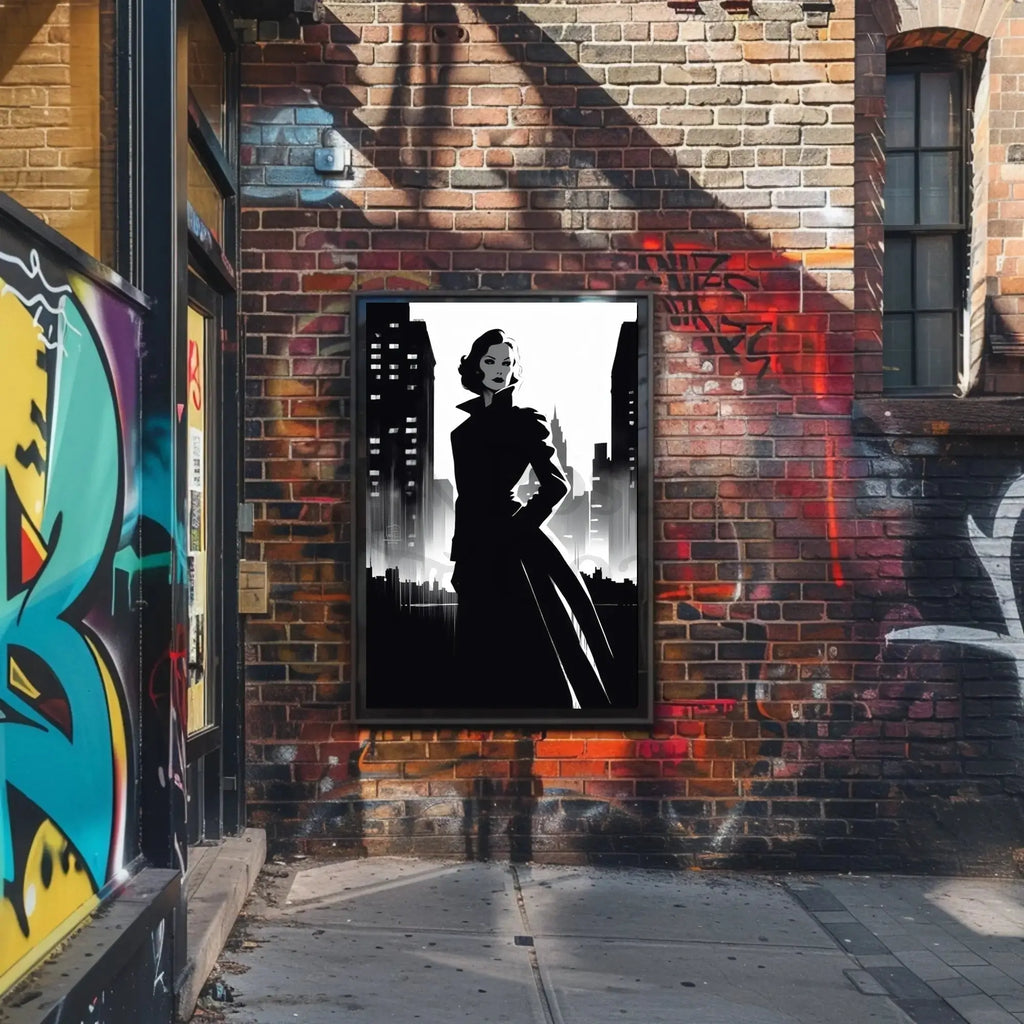 Capture the drama of the metropolis with the Mysterious Woman Noir Cityscape Artistic Poster by PosterGoat. This striking black-and-white silhouette pairs a poised, enigmatic figure with a moody, high-contrast city skyline—an instant statement piece for modern homes, studios, or office walls.