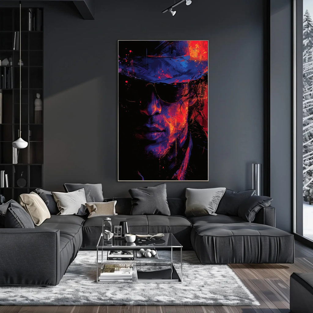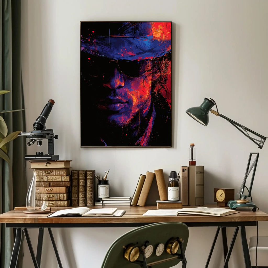 Immerse yourself in the modern, stylized design that uses bold brush strokes and a rich palette of blues, reds, and oranges set against a deep noir backdrop. The subject—a figure with a wide-brim hat and sunglasses—exudes an enigmatic aura, evoking themes of mystery, espionage, and intrigue.