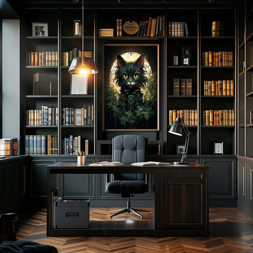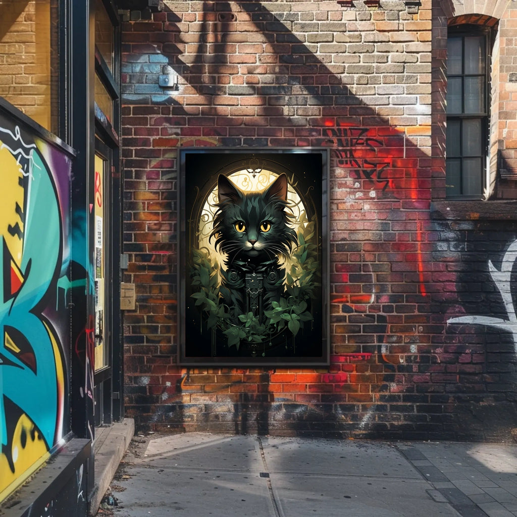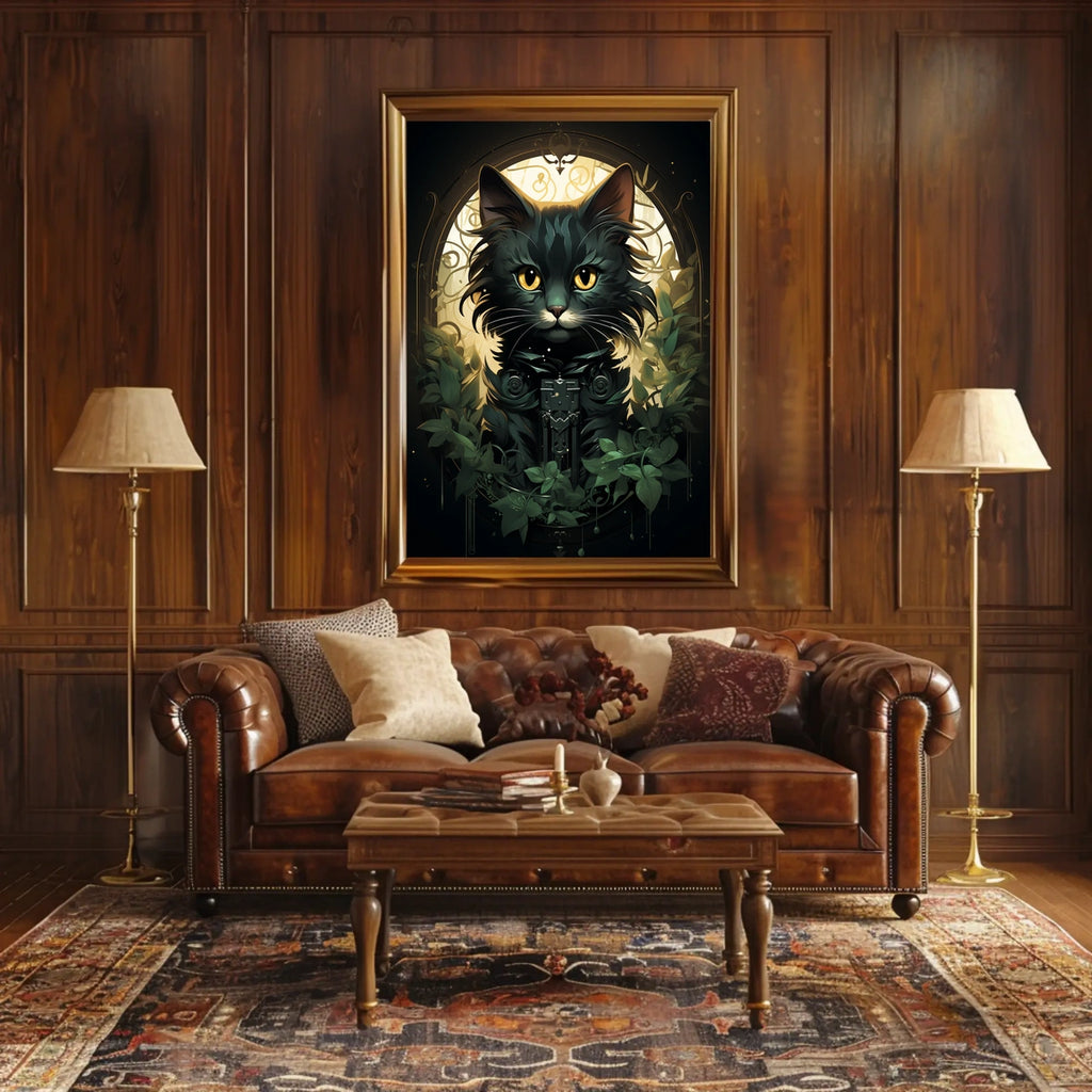 Transform your space with this captivating poster featuring a stylized black cat, its piercing yellow eyes drawing you into a world of mystery and elegance. Encircled by an ornate frame of leafy vines, this artwork exudes a modern, fantastical charm with a nod to Art Nouveau's intricate patterns and natural motifs. The dark tones contrasted with golden highlights create an enchanting ambiance, perfect for those who appreciate mystical and artistic decor. Ideal for cat lovers and art enthusiasts alike, this piece adds a touch of sophistication and magic to any room.
