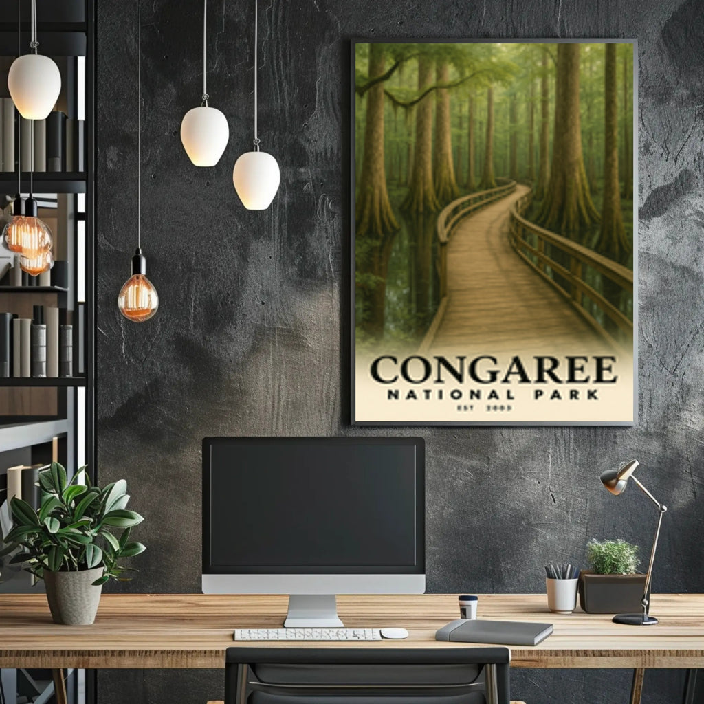 Bring the hushed, mist-filtered charm of Congaree National Park into your home with the PosterGoat "Mystical Boardwalk Through Congaree" vintage travel poster. A gracefully winding wooden boardwalk draws the eye past towering cypress trunks and reflective swamp waters, rendered in a soft, minimalist palette that evokes morning light and quiet exploration.