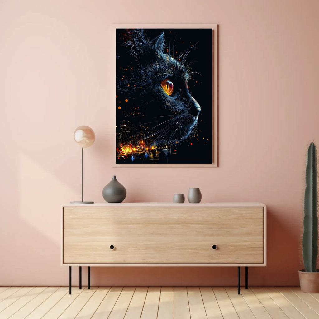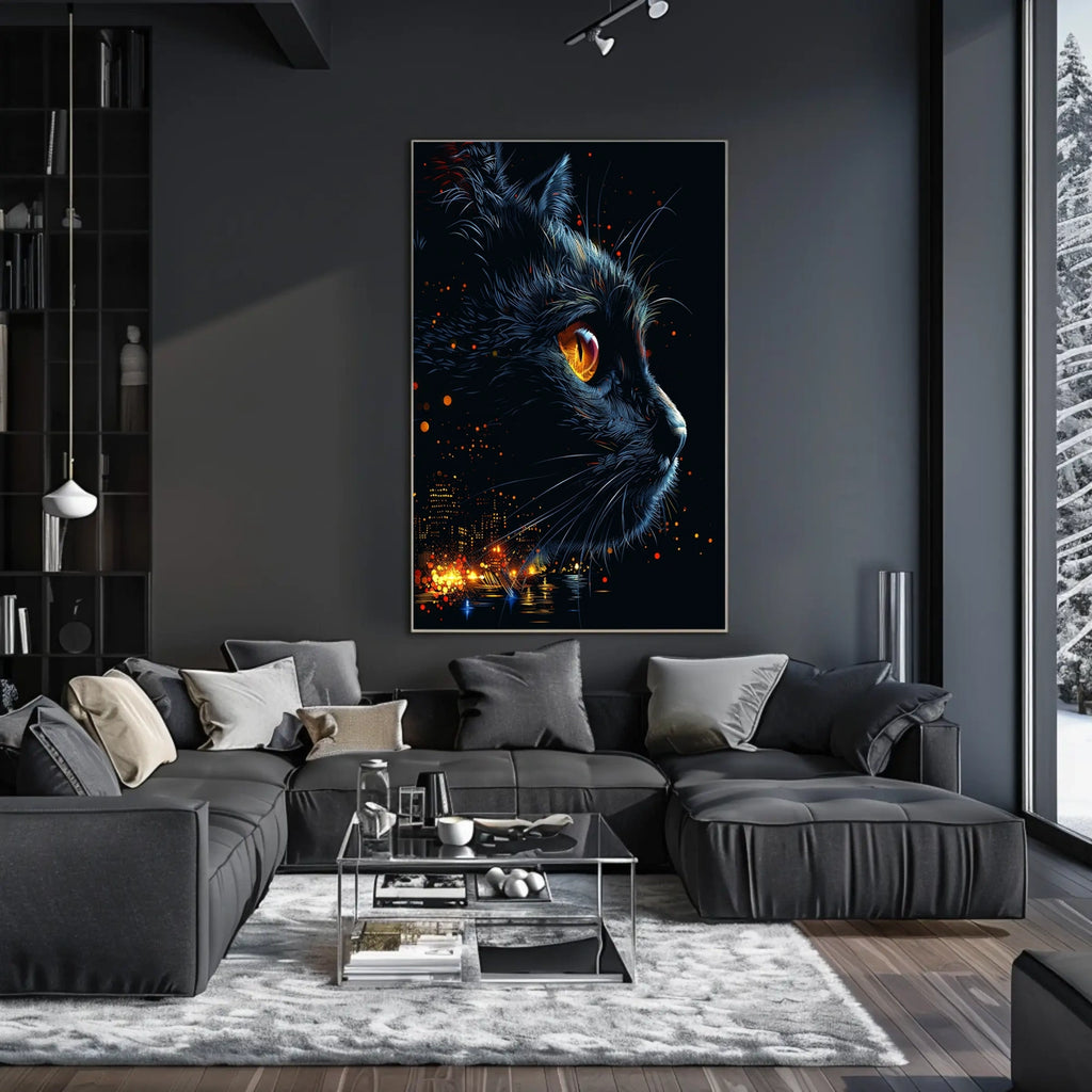 With dynamic lighting and nocturnal tones featuring glowing yellow and orange city lights, this piece lends energy to any space—from living rooms and studios to classrooms and offices. It works beautifully as an abstract cat poster and urban skyline poster for modern art print enthusiasts, complementing bold wall decor and contemporary interiors.