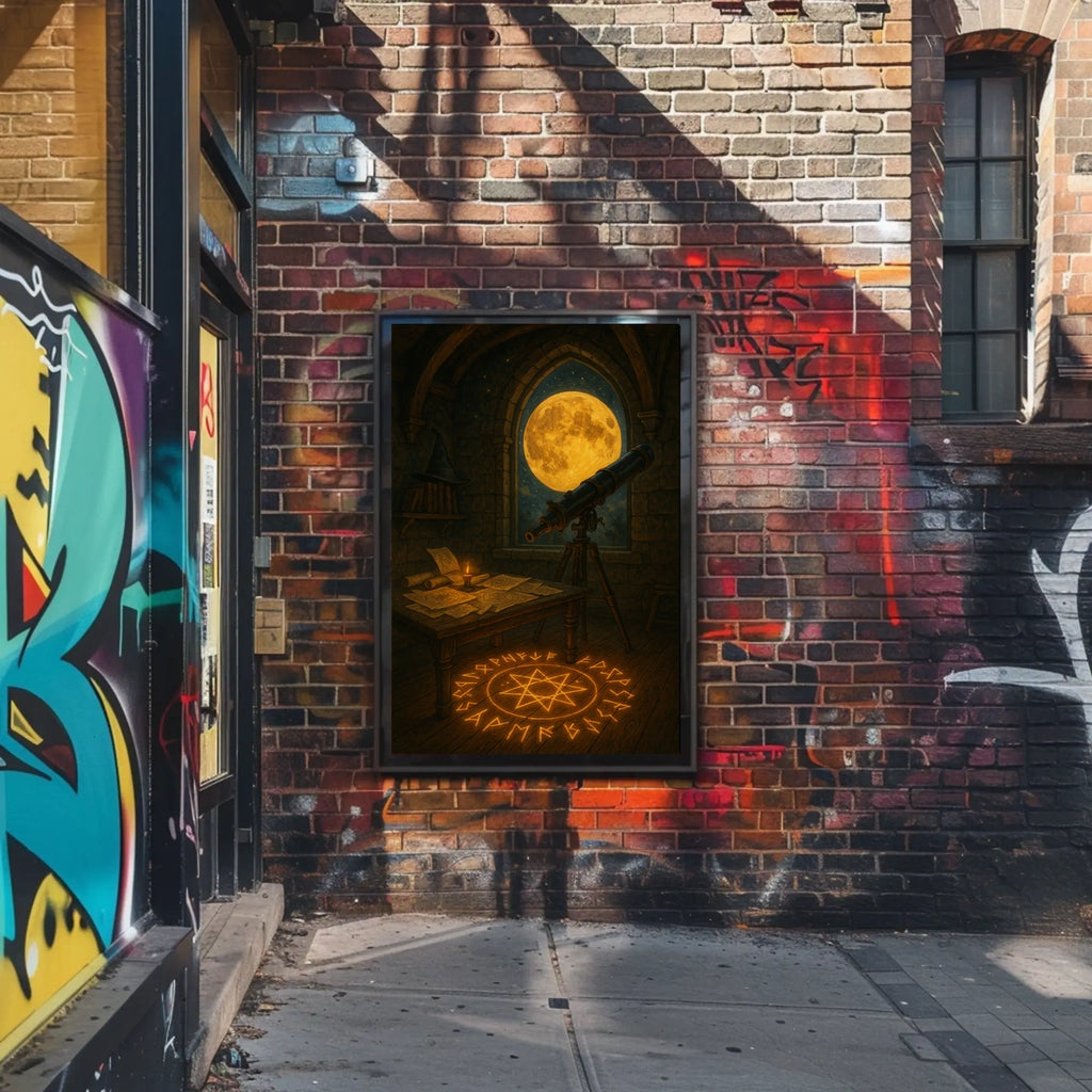 Step into a world of celestial wonder with this poster featuring a mystical observatory bathed in warm candlelight and the cool glow of a full moon. The scene unfolds in a medieval-like room, where a telescope points toward the night sky, an old wooden table is strewn with maps and parchment, and a witch's hat rests on a shelf of ancient books. A glowing magic circle with cryptic runes on the floor adds an arcane touch, inviting exploration.
