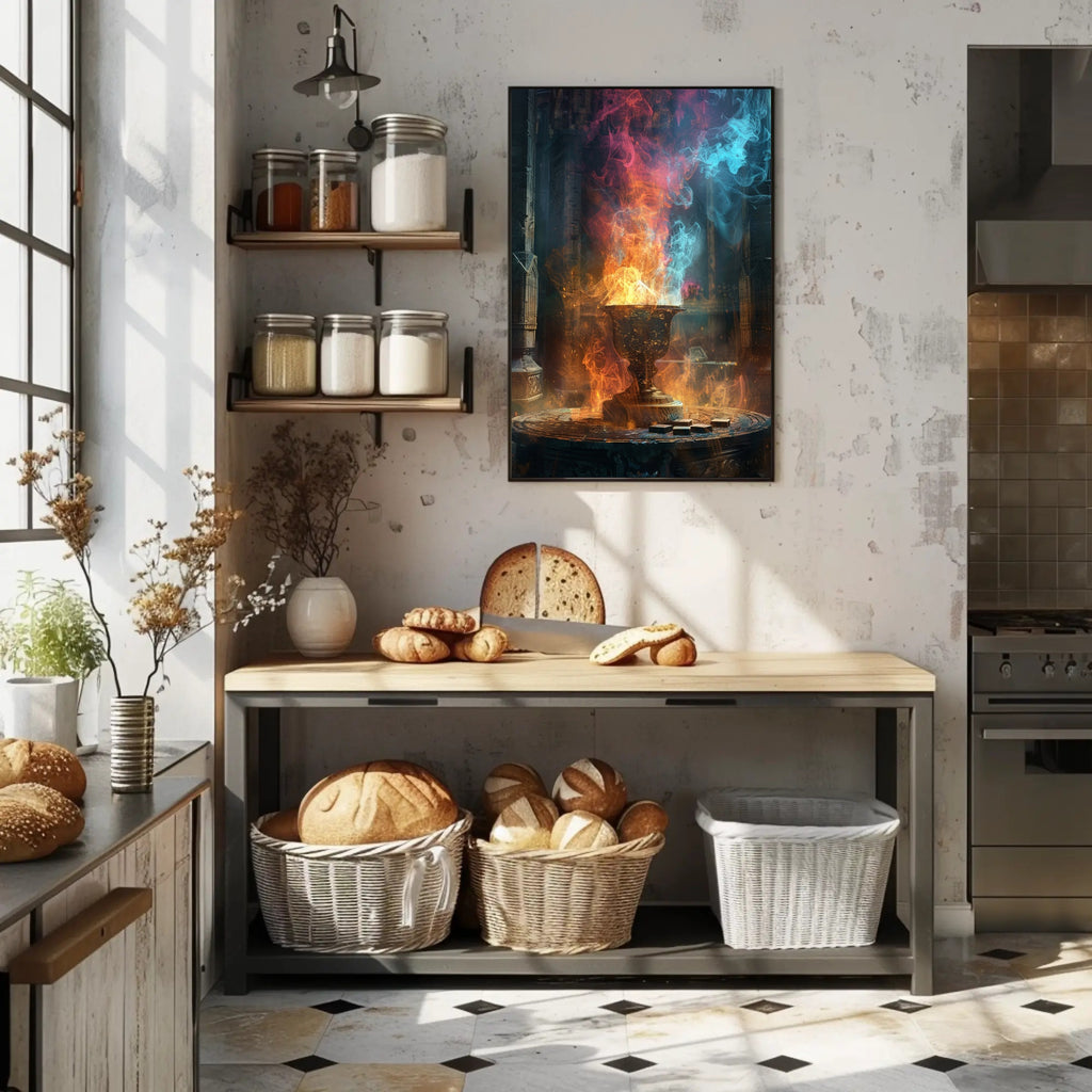 Striking imagery: A richly detailed chalice and photorealistic flames create a focal piece that draws the eye and sparks imagination.