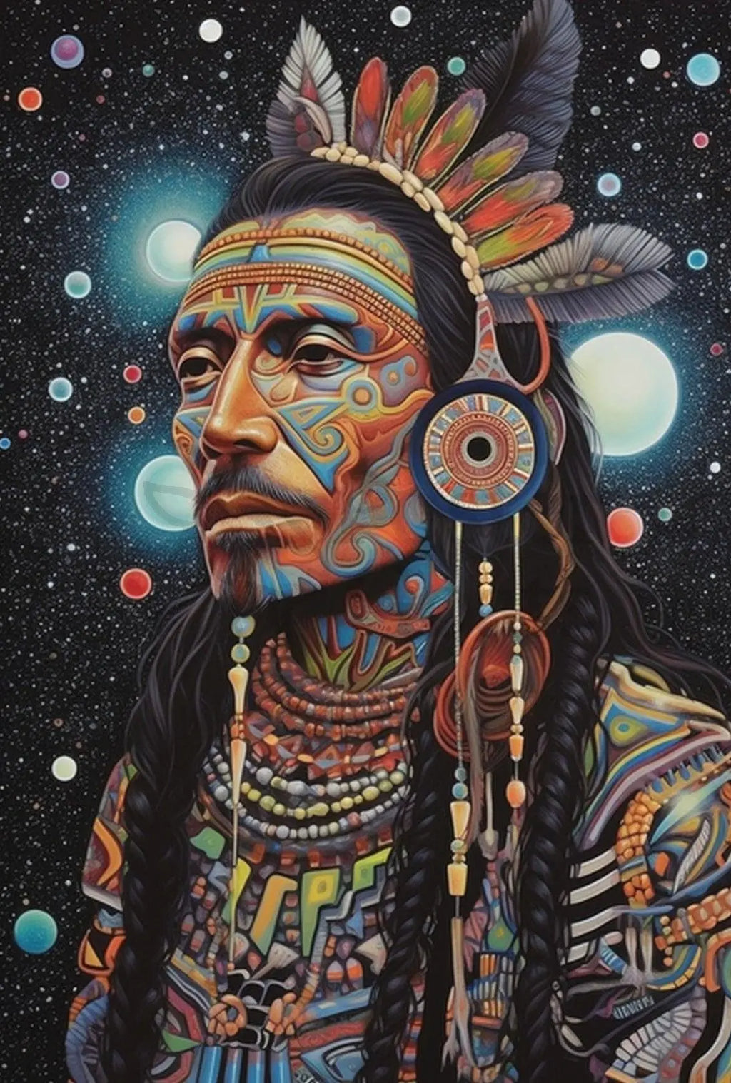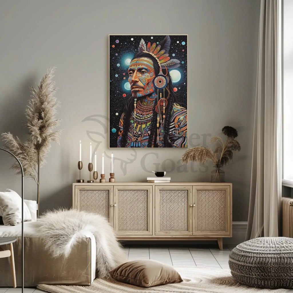 Elevate your walls with the Mystical Cosmic Tribal Heritage Poster — a bold fusion of indigenous-inspired motifs and celestial wonder that transforms any room into a conversation piece. This PosterGoat exclusive captures a stoic tribal figure adorned with vibrant face paint, layered beadwork, braided hair and feathered headdress, set against a luminous starfield punctuated by glowing planets and orbs for a mesmerising, otherworldly effect.