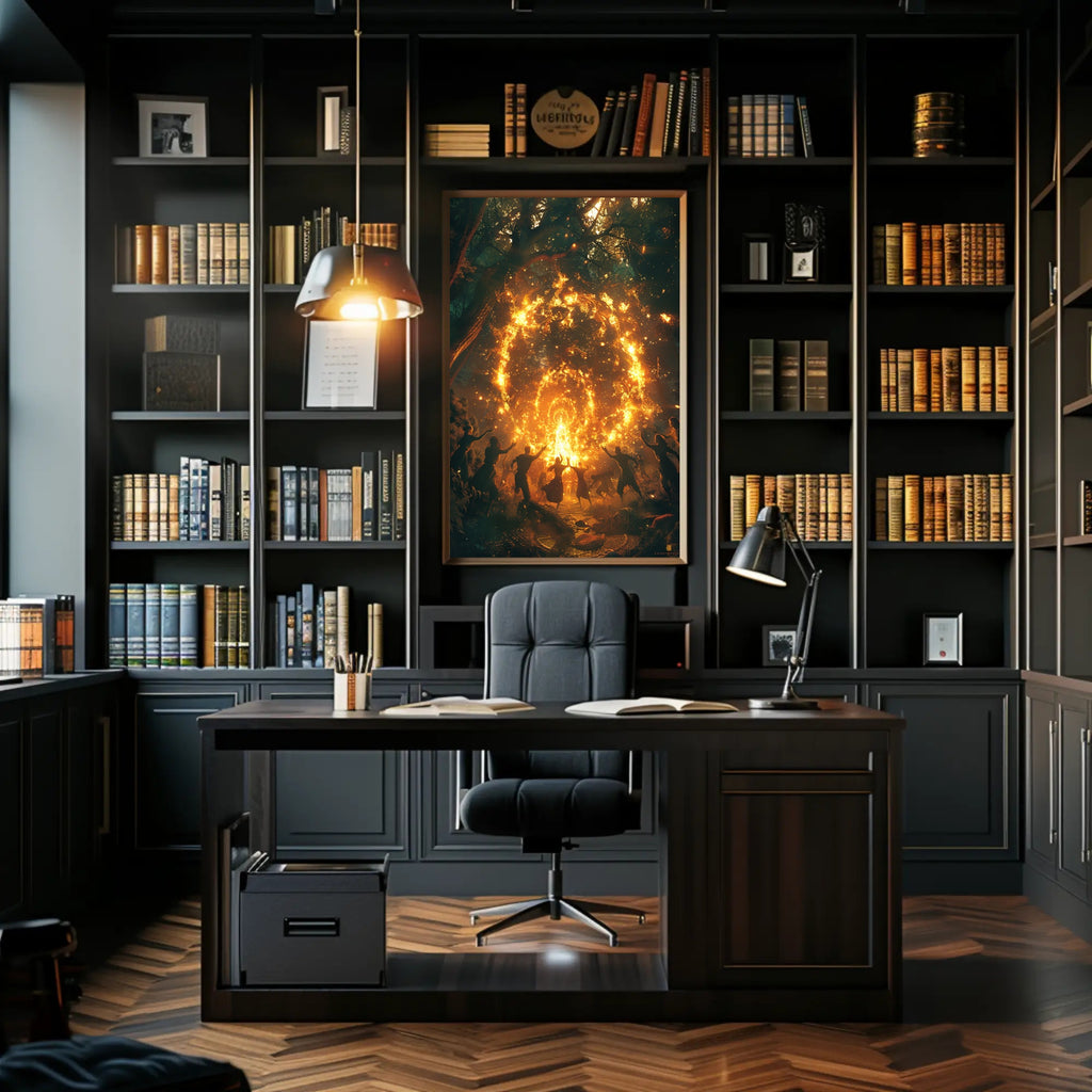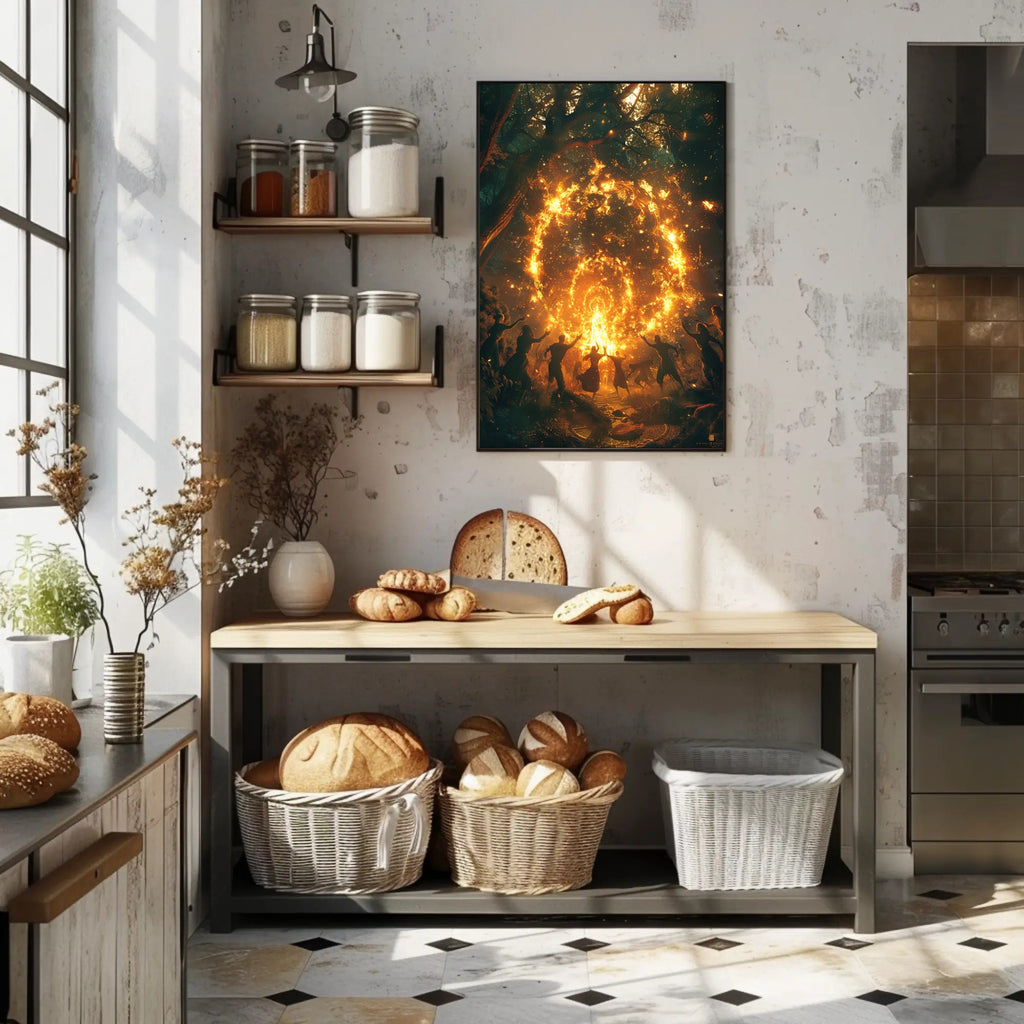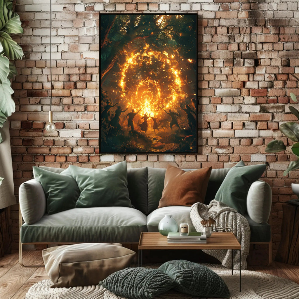 Bring a slice of myth and mystery to your walls with the "Mystical Dance in Enchanted Forest" poster by PosterGoat. This fantasy poster captures a ritualistic circle of silhouetted dancers beneath an ancient canopy, igniting the scene with a swirling ring of fiery light that glows like a living portal. Photorealistic detail and dramatic contrast make this piece a stunning focal point for any room seeking ethereal wall decor.