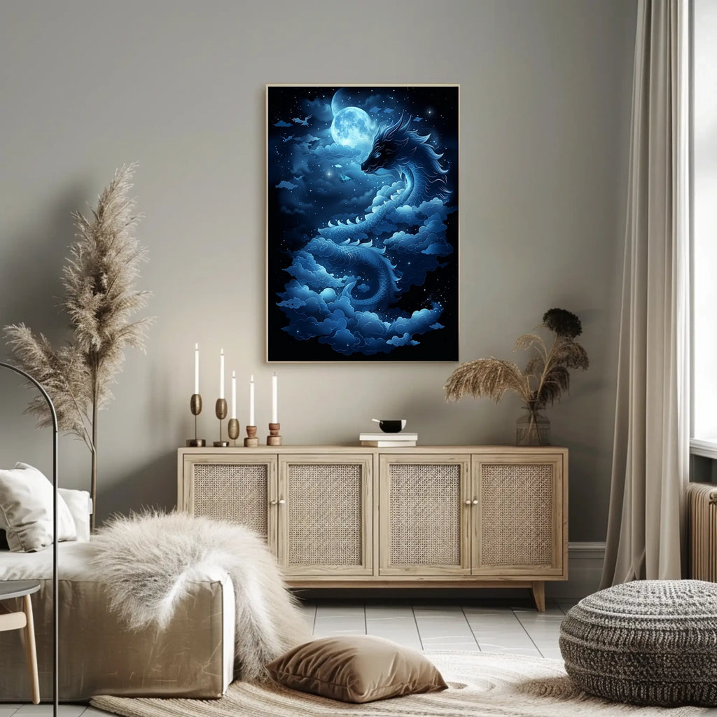 Immerse yourself in blues and whites that create an ethereal atmosphere, with a majestic dragon soaring through a celestial sky under a radiant full moon. The modern, surreal style enhances the dreamlike quality of the artwork, making it a striking addition to any fantasy art collection.