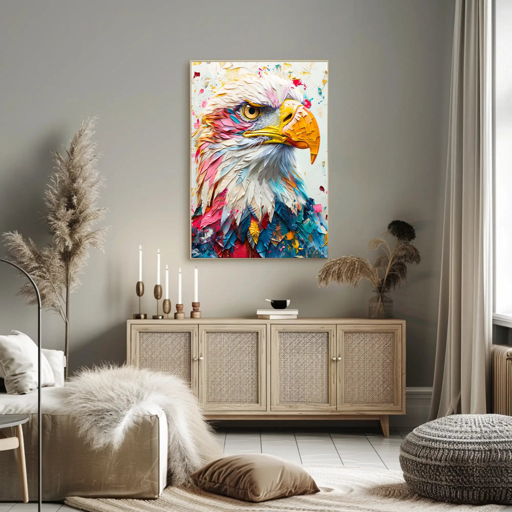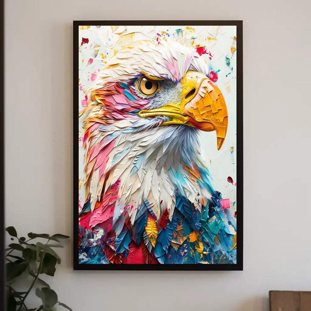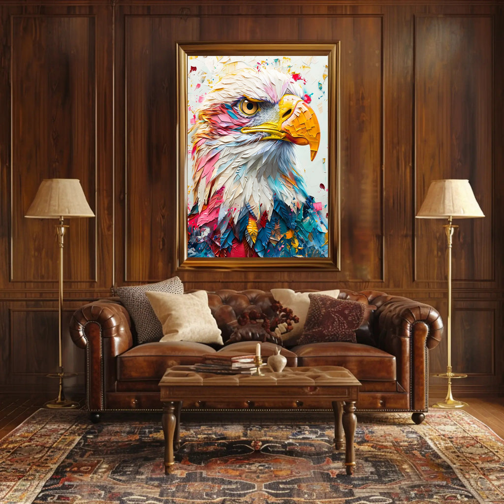 Color & texture: Rich, saturated tones and dynamic accents bring the scene to life; textured feather-like strokes and bold highlights provide a three-dimensional impression that pops on the wall.