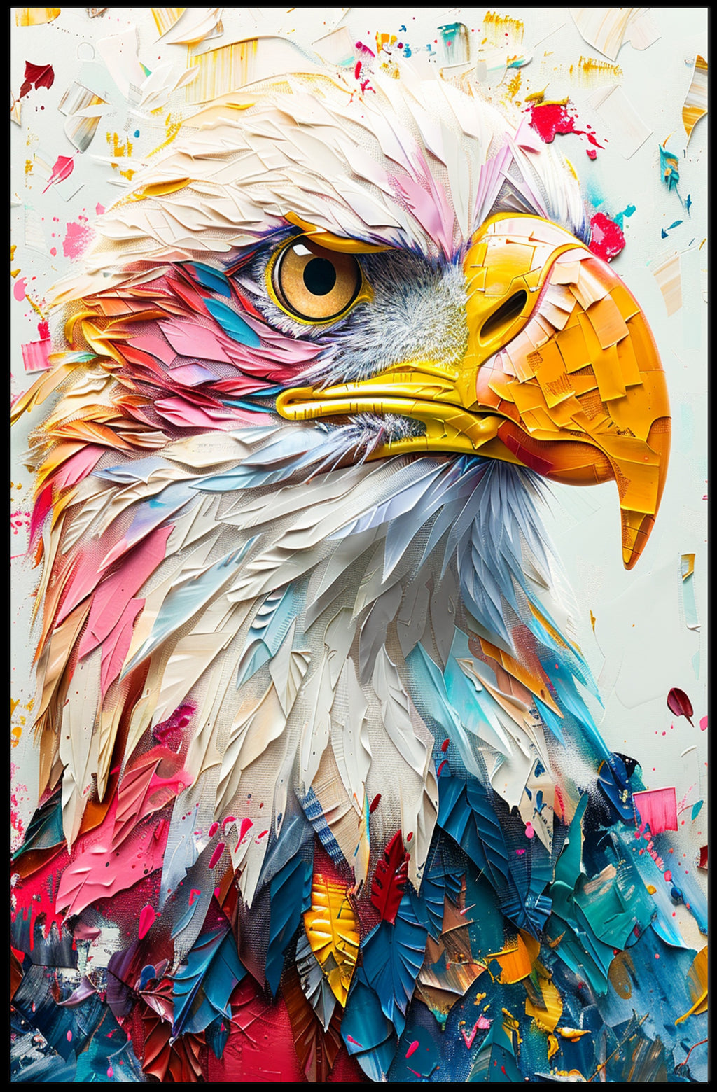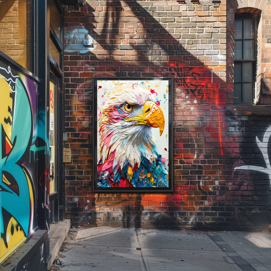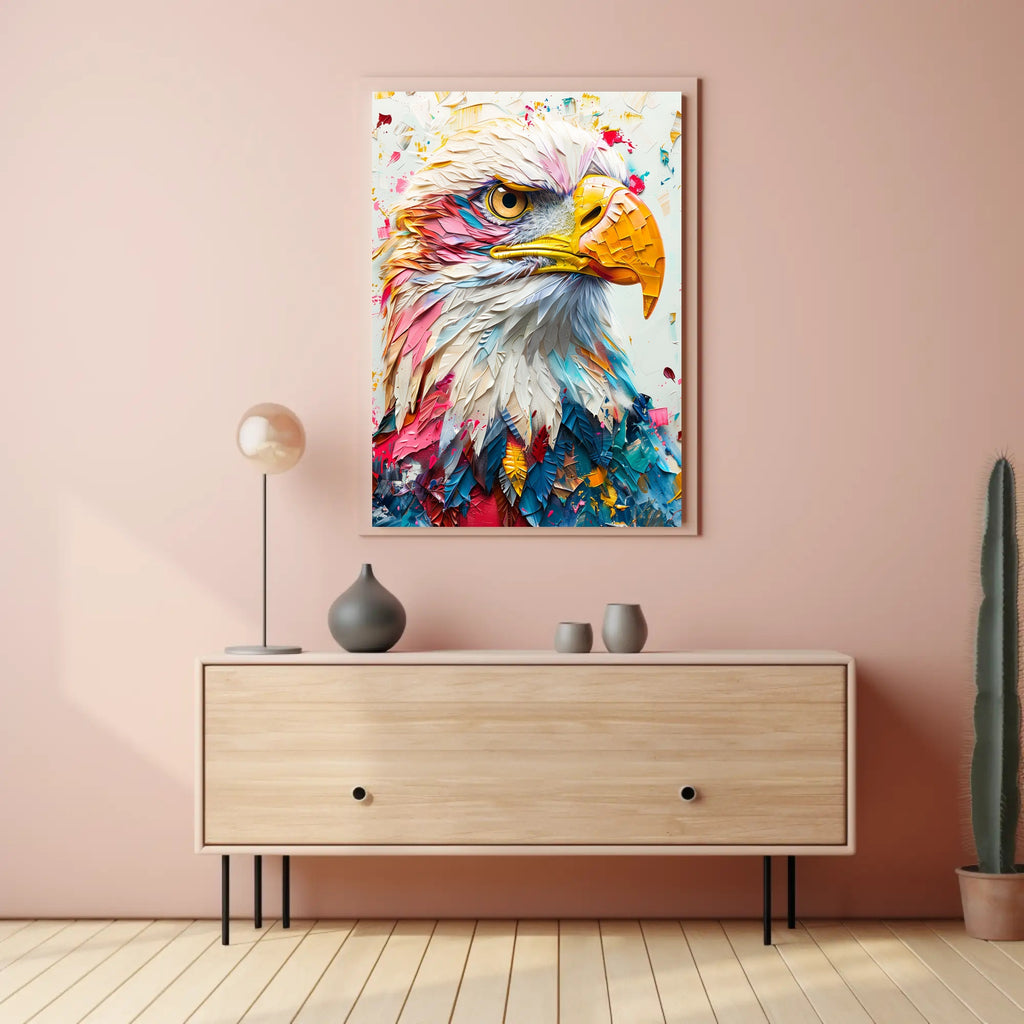 Color & texture: Rich, saturated tones and dynamic accents bring the scene to life; textured feather-like strokes and bold highlights provide a three-dimensional impression that pops on the wall.