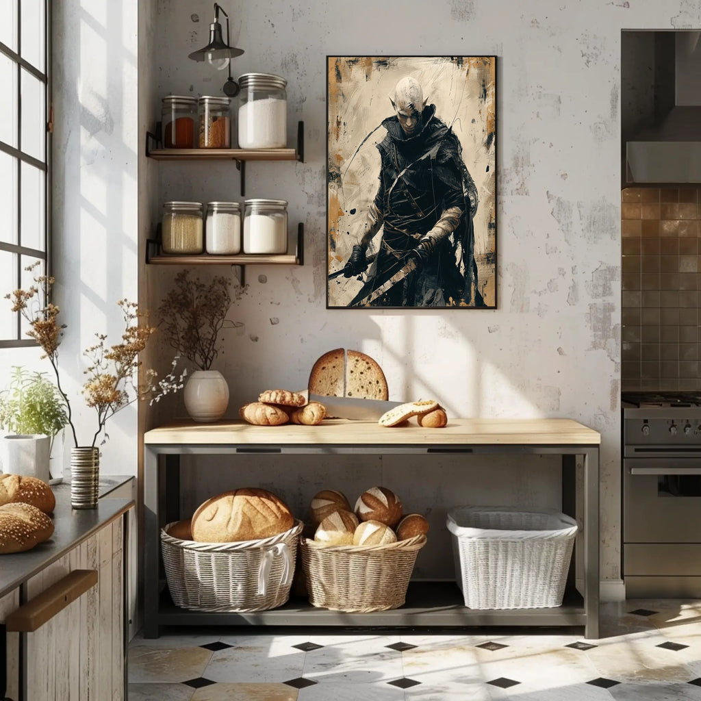 This poster belongs to Home & Garden > Decor > Artwork > Posters, Prints, & Visual Artwork > Posters and fits seamlessly into curated decor schemes or themed collections. The composition emphasizes an intense expression and finely rendered costume details—leather straps, weathered blades, and a hooded silhouette—making it both a conversation piece and a mood-setter.