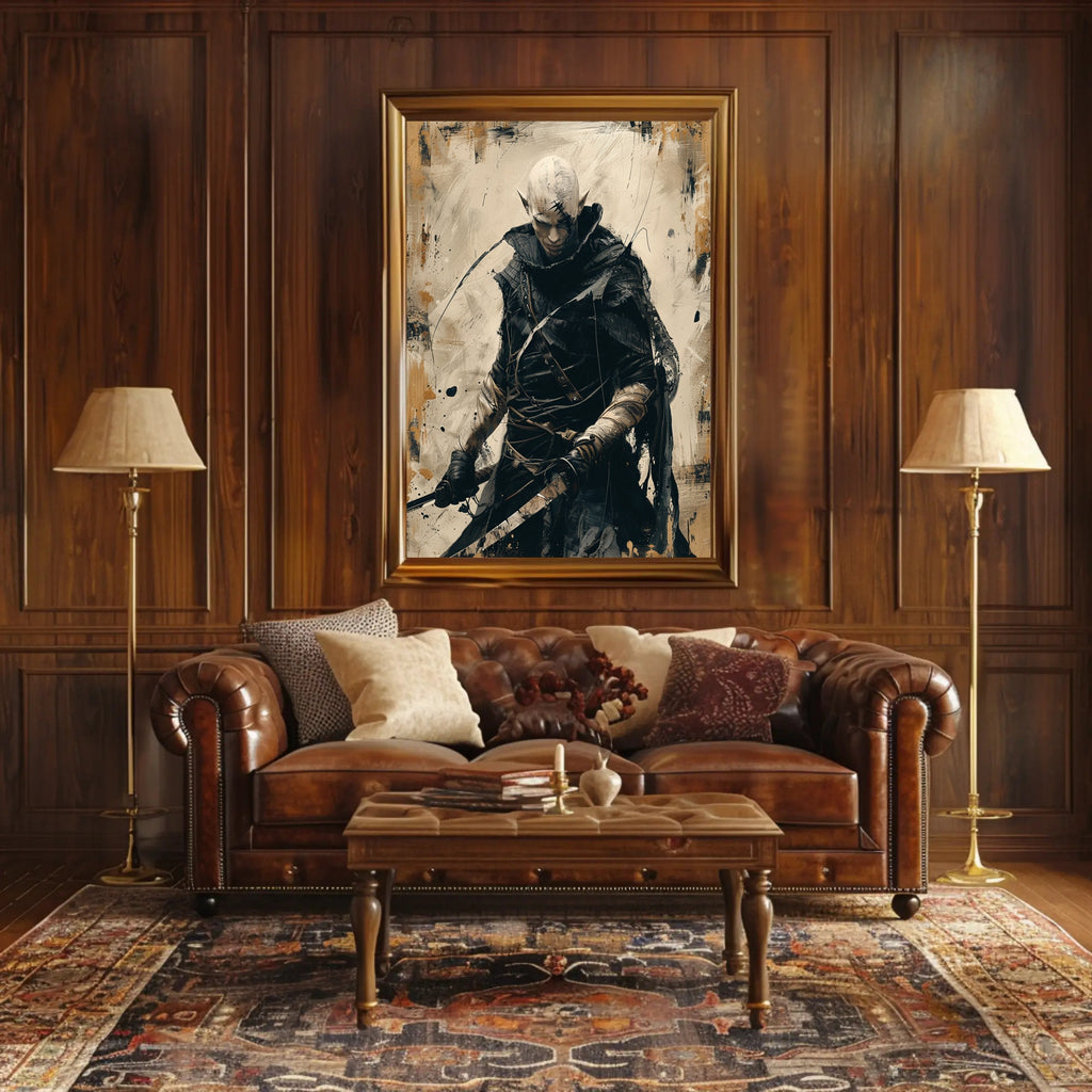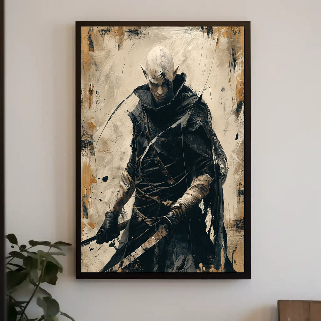 Striking focal art: A dynamic pose poster featuring a cloaked elf warrior, wrapped forearms, and twin blades—perfect for fans of mythical character decor and adventure-genre art.