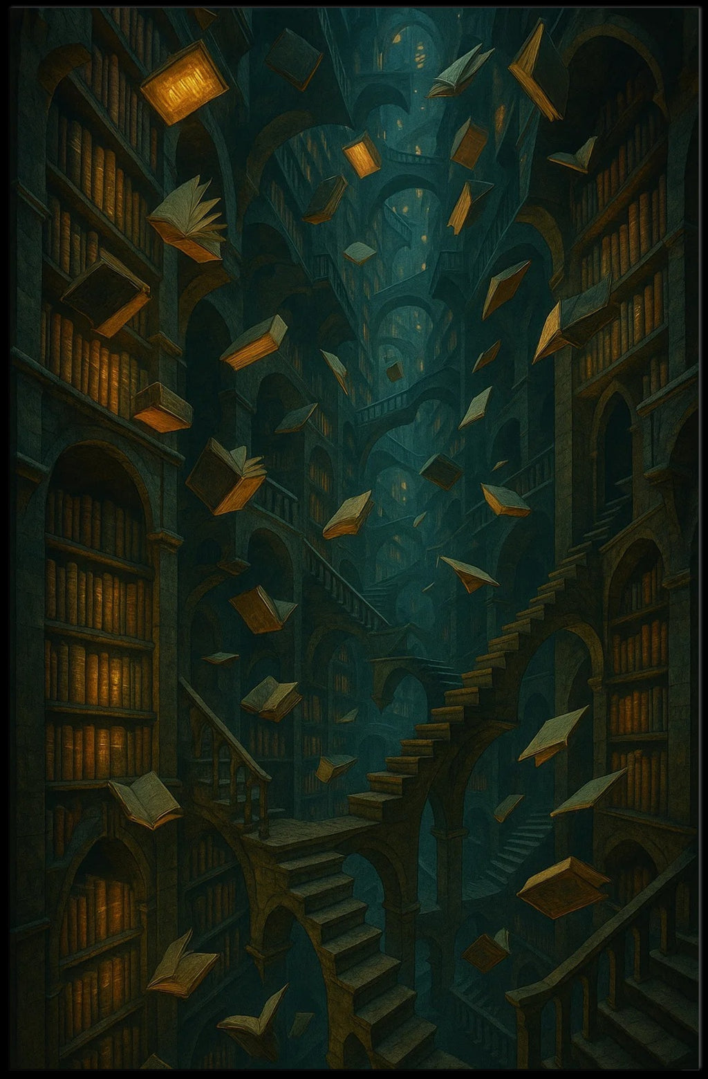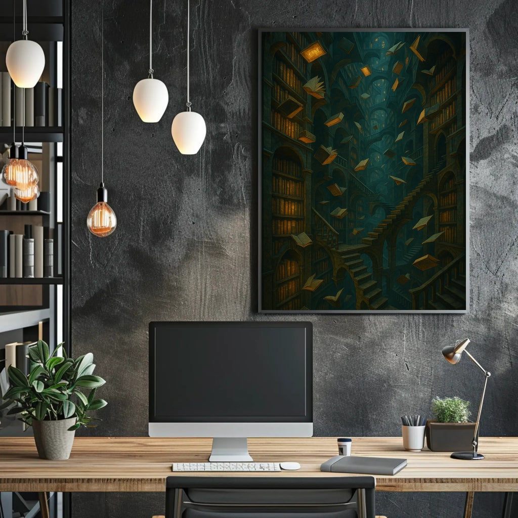 Step into an enchanted world with this surreal library poster, capturing a fantastical realm of endless books and magical wonders. The scene is an intricate blend of floating, gravity-defying books and intricately carved staircases, creating a mysterious and awe-inspiring atmosphere. The towering library shelves seem to stretch infinitely, drawing the viewer's eyes upward into a realm of imagination and knowledge. Deep blues and warm glowing highlights from the open book pages enhance the dark, moody ambiance, inviting you to explore the mysteries it holds. This artwork is perfect for lovers of fantasy and the mystical unknown.
