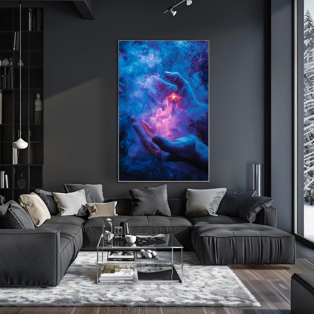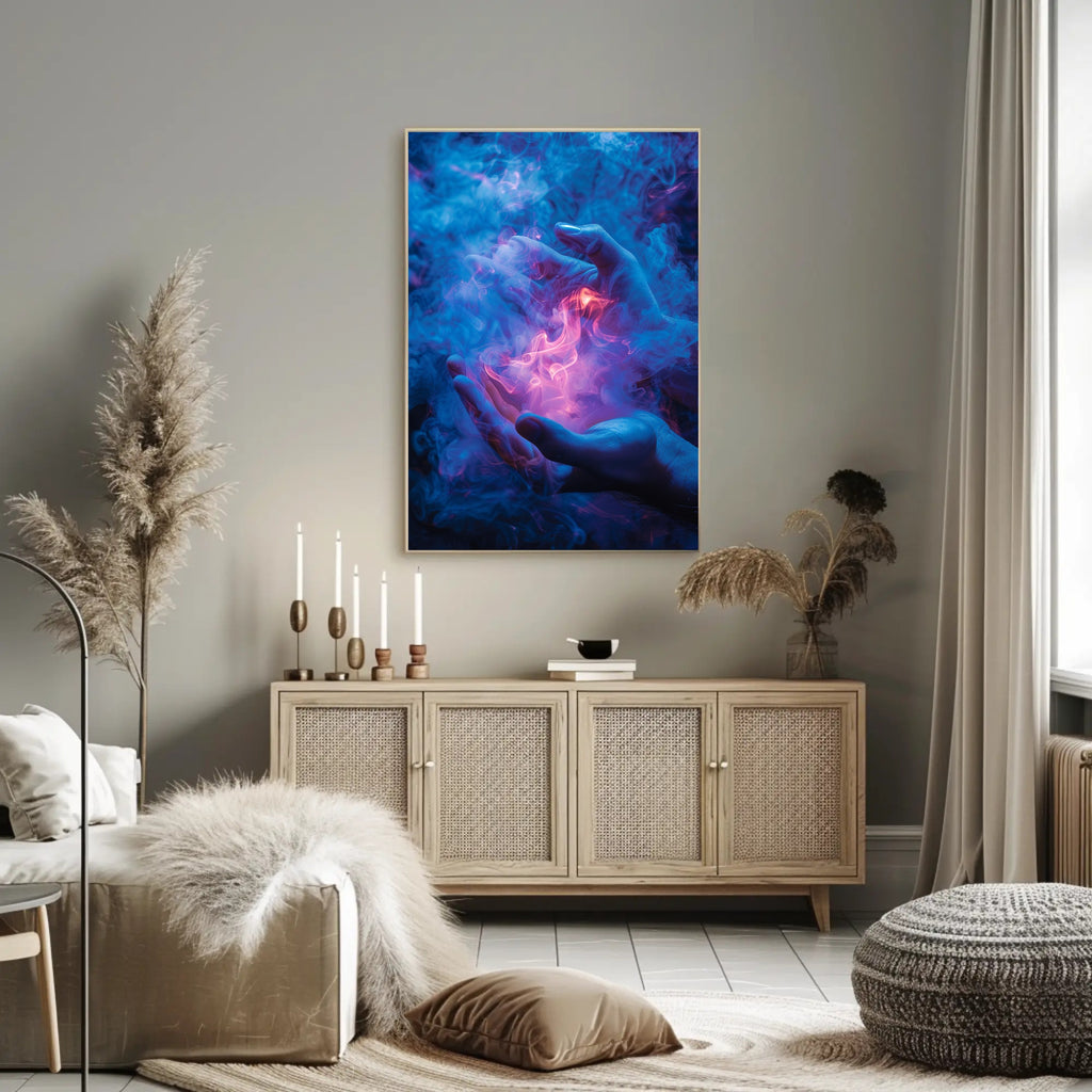 Rendered in vivid blues and glowing magenta, this art print captures mysticism and motion: delicate tendrils of smoke weave around two hands as a luminous, otherworldly flame flickers at their center. The dramatic contrast and Pop Art-inspired palette make this poster an eye-catching focal point for living rooms, studios, bedrooms, or office spaces.