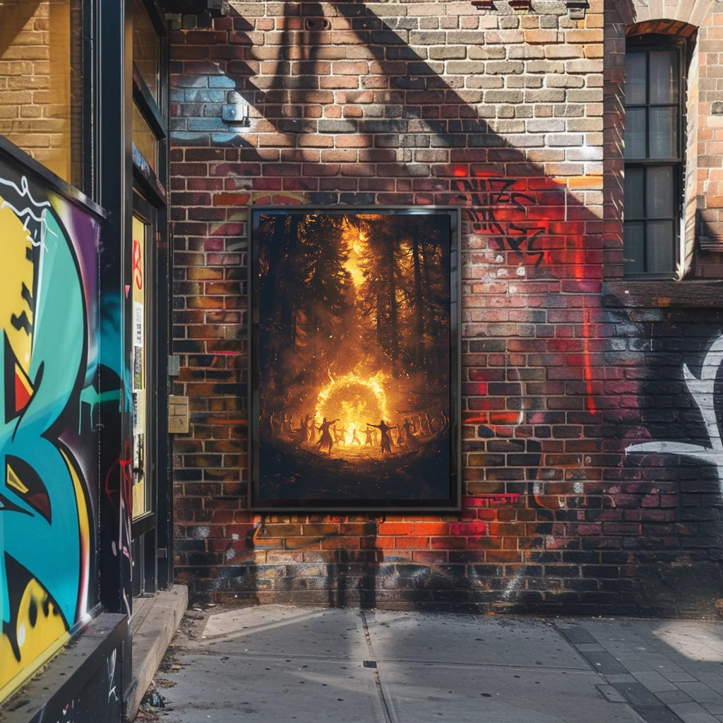 Evocative storytelling: A circle of dancing figures around a blazing portal and a crescent moon framed by tall forest silhouettes invite imagination — perfect for fans of mythology, fantasy art, and surreal forest scenes.