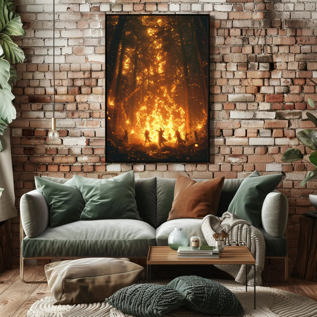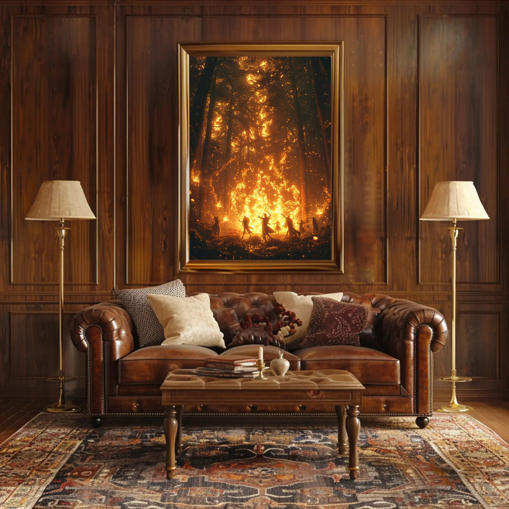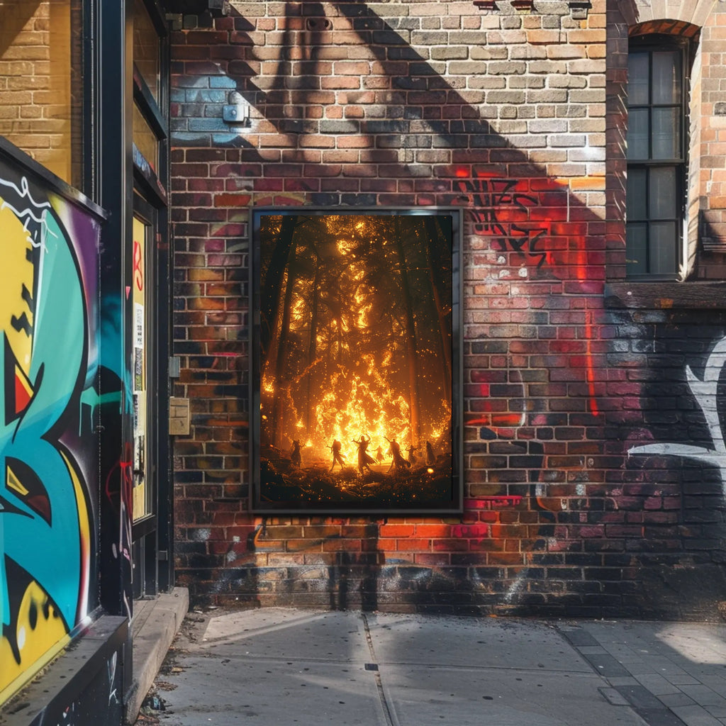 Transform any room into a realm of ancient energy with the Mystical Forest Ritual Fantasy Poster from PosterGoat. This evocative artwork captures a moonless nighttime forest lit by a towering, warm amber blaze and silhouetted figures engaged in a primal ritual — a dramatic blend of folklore-inspired storytelling and photorealistic mystical style.