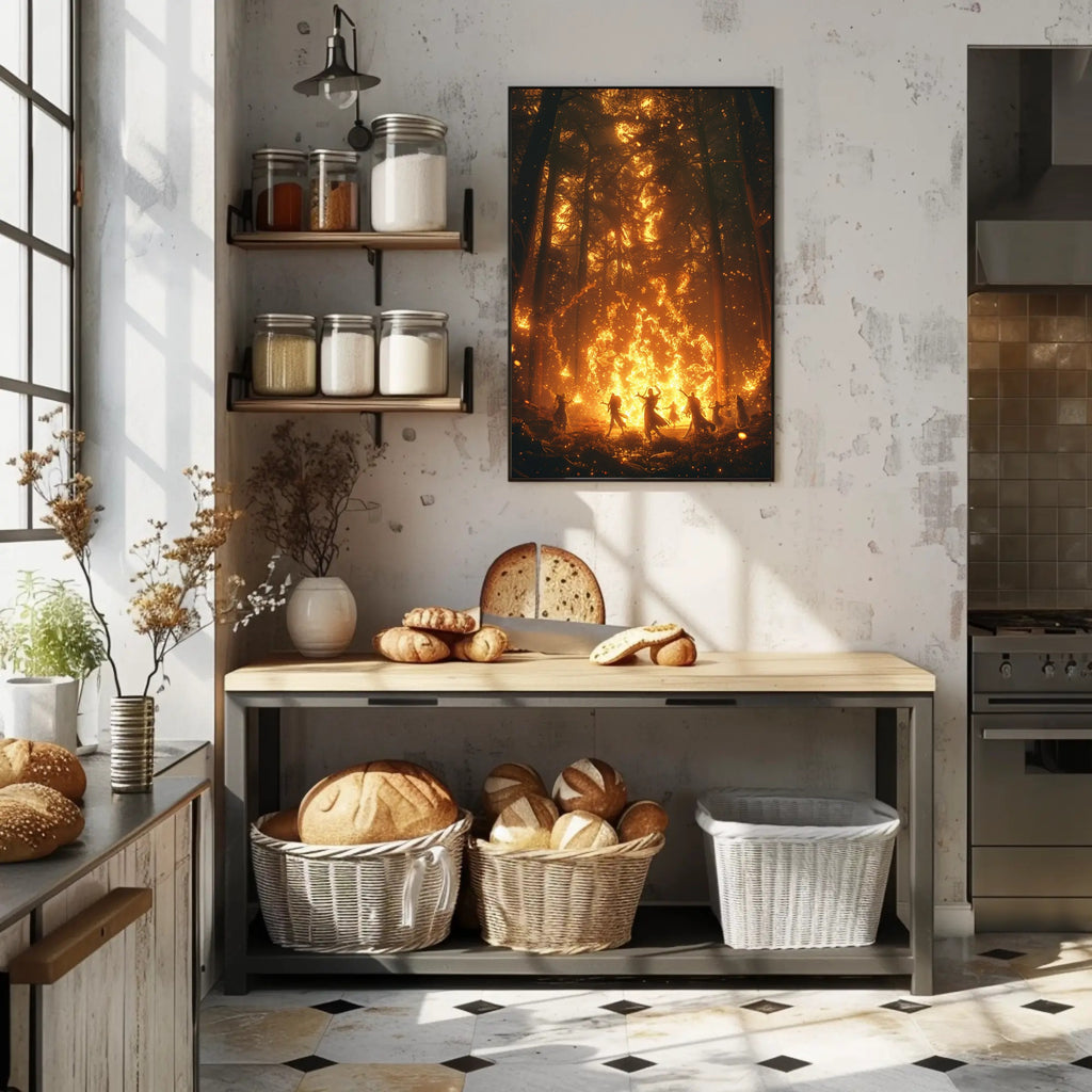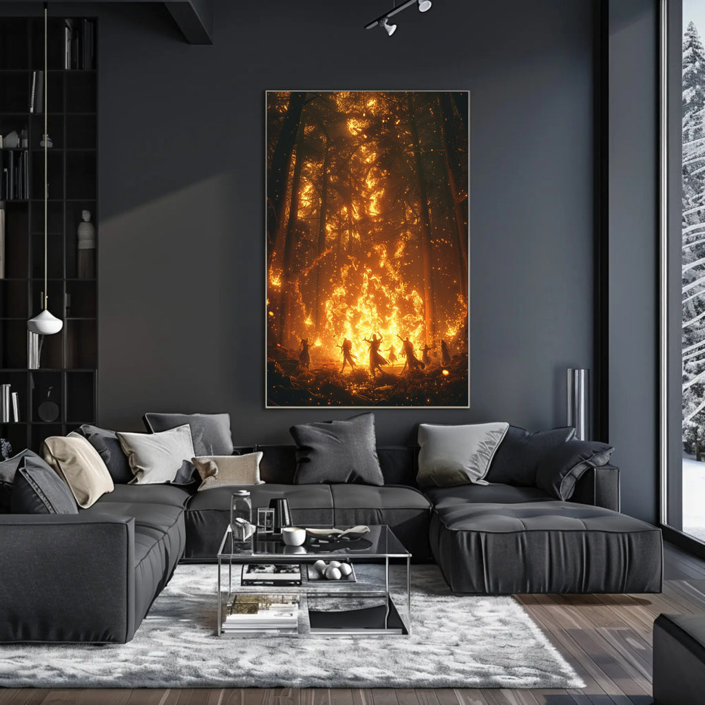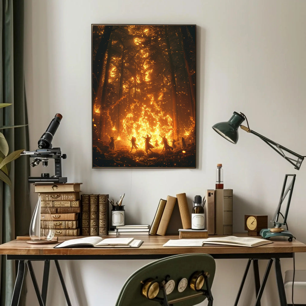 Transform any room into a realm of ancient energy with the Mystical Forest Ritual Fantasy Poster from PosterGoat. This evocative artwork captures a moonless nighttime forest lit by a towering, warm amber blaze and silhouetted figures engaged in a primal ritual — a dramatic blend of folklore-inspired storytelling and photorealistic mystical style.